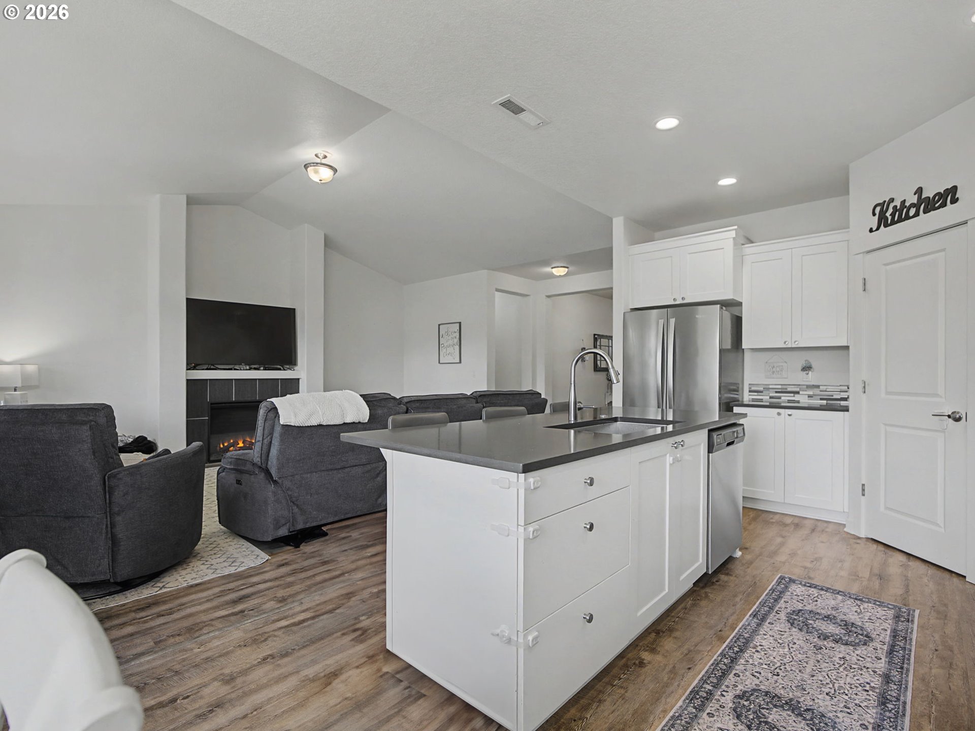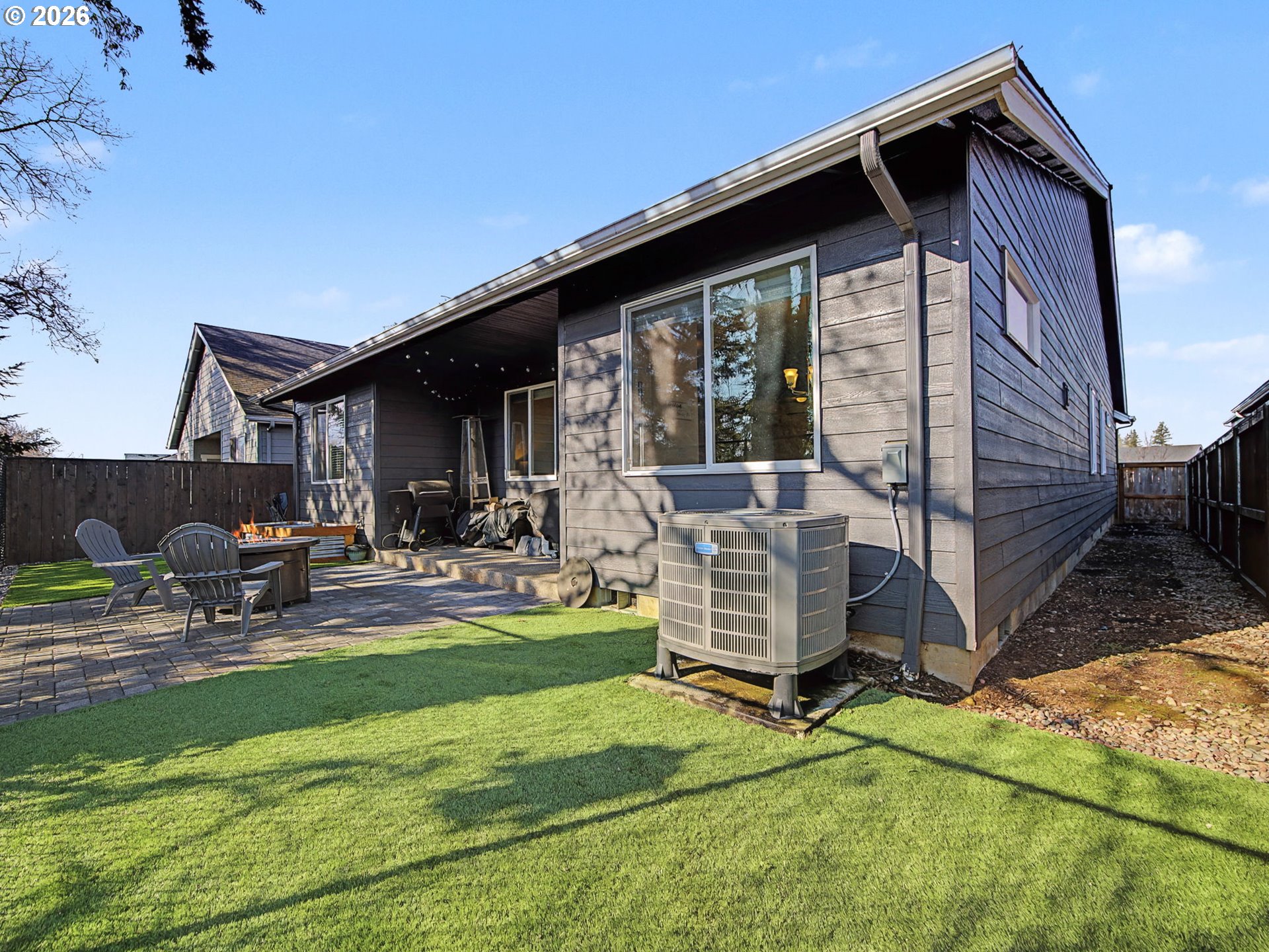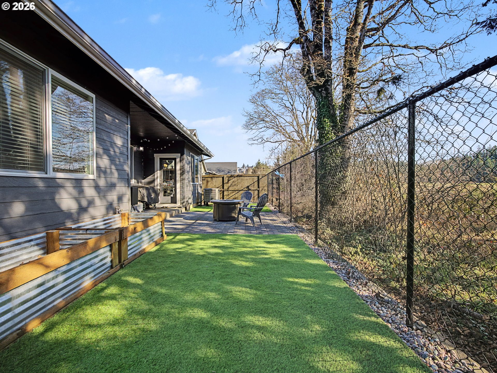 Well-kept one-level ranch featuring 4 bedrooms, including one that works well as an office. Wide hallway and vaulted ceilings make the main living area feel airy and comfortable with the electric fireplace adding a cozy touch. The kitchen offers quartz countertops, stainless steel appliances, and a pantry. The primary suite features its own vaulted ceilings, a double vanity, walk-in shower, and a spacious walk-in closet.The fenced backyard is low-maintenance with turf, raised garden beds, and NO neighbors behind—just trees and an open field for added privacy. Located on the edge of the neighborhood, this home has easy access in and out. Move-in ready and in great condition.