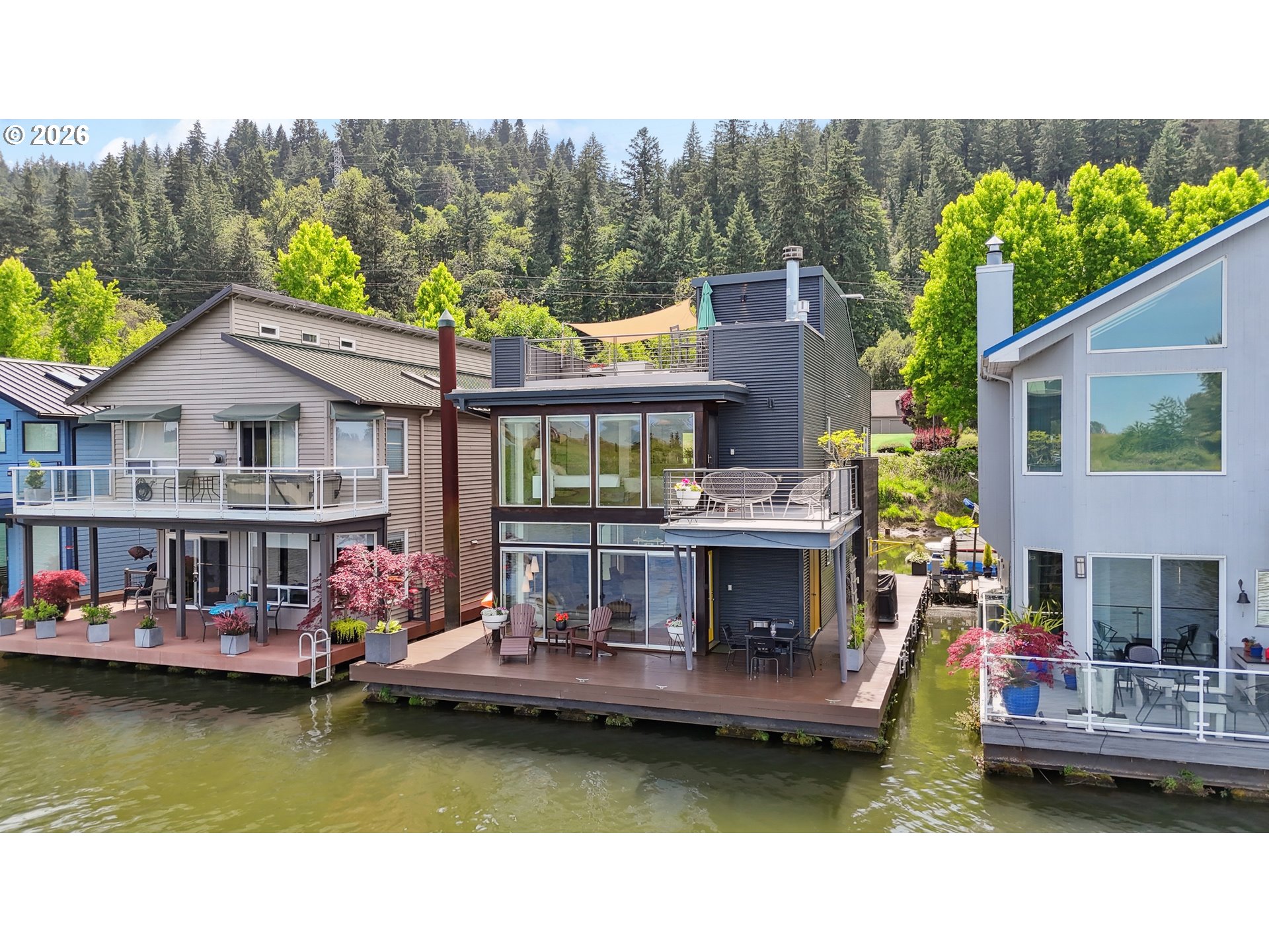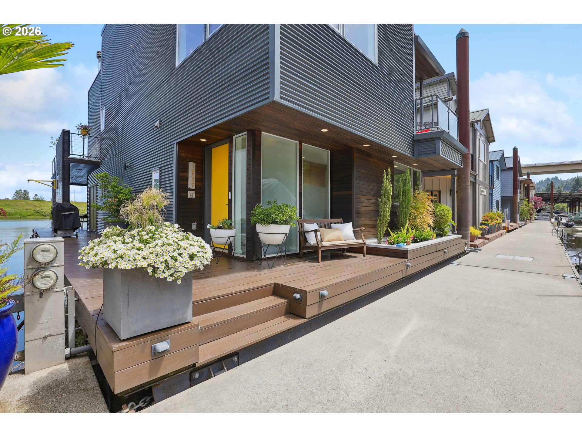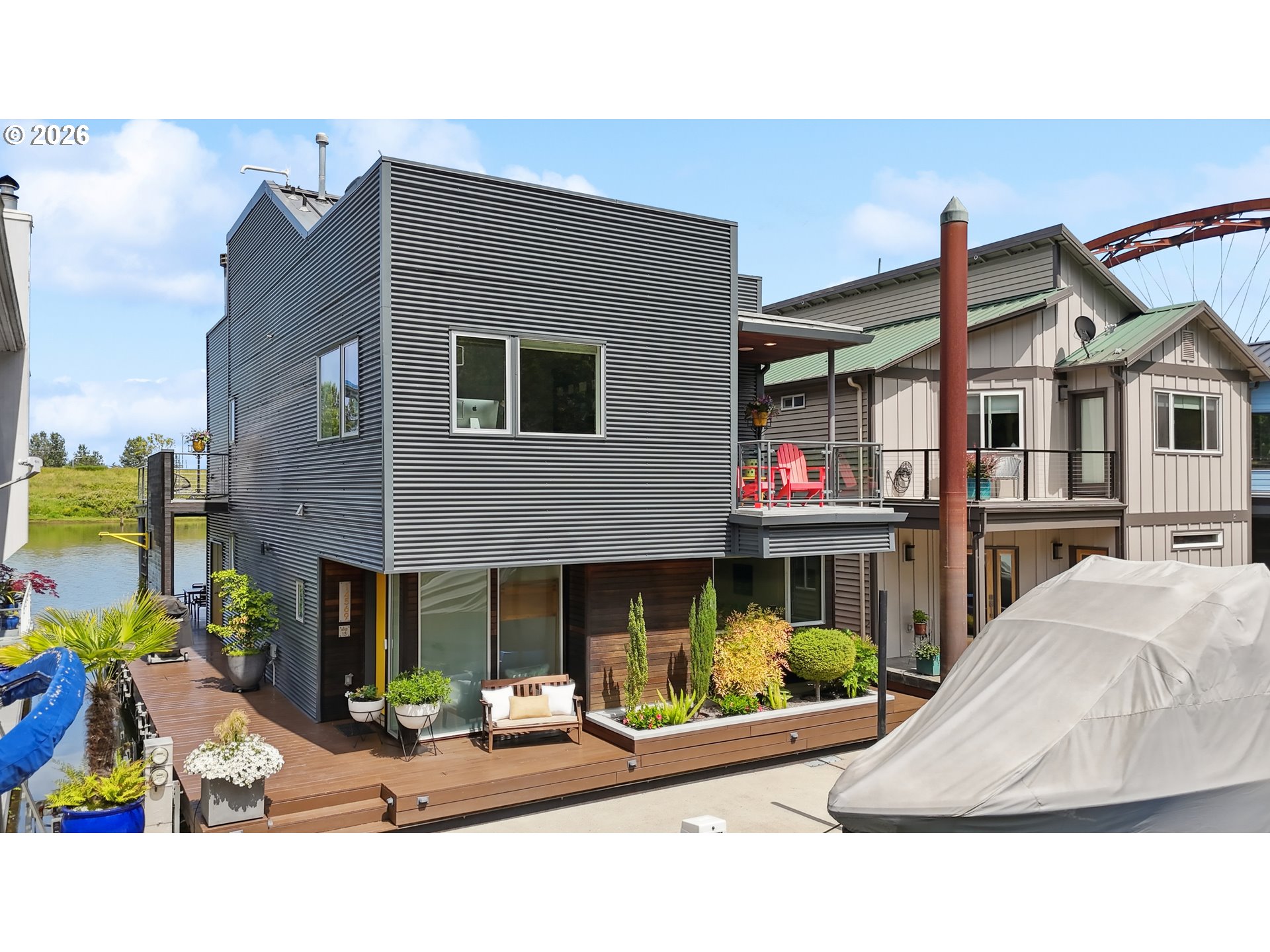 - One of those floating homes that rarely comes on market, an absolute must-have with standout design, craftsmanship, and an unbeatable marina. Located at Channel Island Marina - the premier floating home moorage in the Portland area, this home is just minutes from the city, yet offers a true sense of privacy and serenity. The sale includes slip ownership, currently valued at approximately $350,000, with extremely strong potential for continued appreciation value. Slip ownership also includes a two-car garage with a finished loft, rights to both sides of the dock, and all of the surrounding upland area, all professionally maintained, along with access to a private community gym and boat storage. Featured in top design publications and built by Even Construction, this Channel Island masterpiece blends bold architecture with timeless craftsmanship. Wrapped in sleek horizontal metal siding with warm wood accents, the home features floor-to-ceiling windows that fully capture the river. Inside, enjoy a slab tile entry, oak hardwood floors, custom cherry cabinetry, and a chef’s kitchen with high-end stainless appliances and a granite island. Designed for both entertaining and everyday living, the home features bars on all three levels, multiple upper decks, and a full rooftop deck. The primary suite offers stunning river views, a fireplace, soaking tub, private deck, and access to upper decks on both sides to enjoy both sunrise and sunset every morning and evening. With 3 bedrooms, 3 full baths, and flexible living space, including a guest room with a Murphy bed, this home offers comfort and versatility. Channel Island is one of the most exclusive and sought-after floating home communities on the river, offering a level of ownership, amenities, and overall experience that is truly unmatched. Renowned for its strong sense of community, pride of ownership, and beautifully maintained setting and neighborhood, it delivers an exceptional river lifestyle minutes from the city.