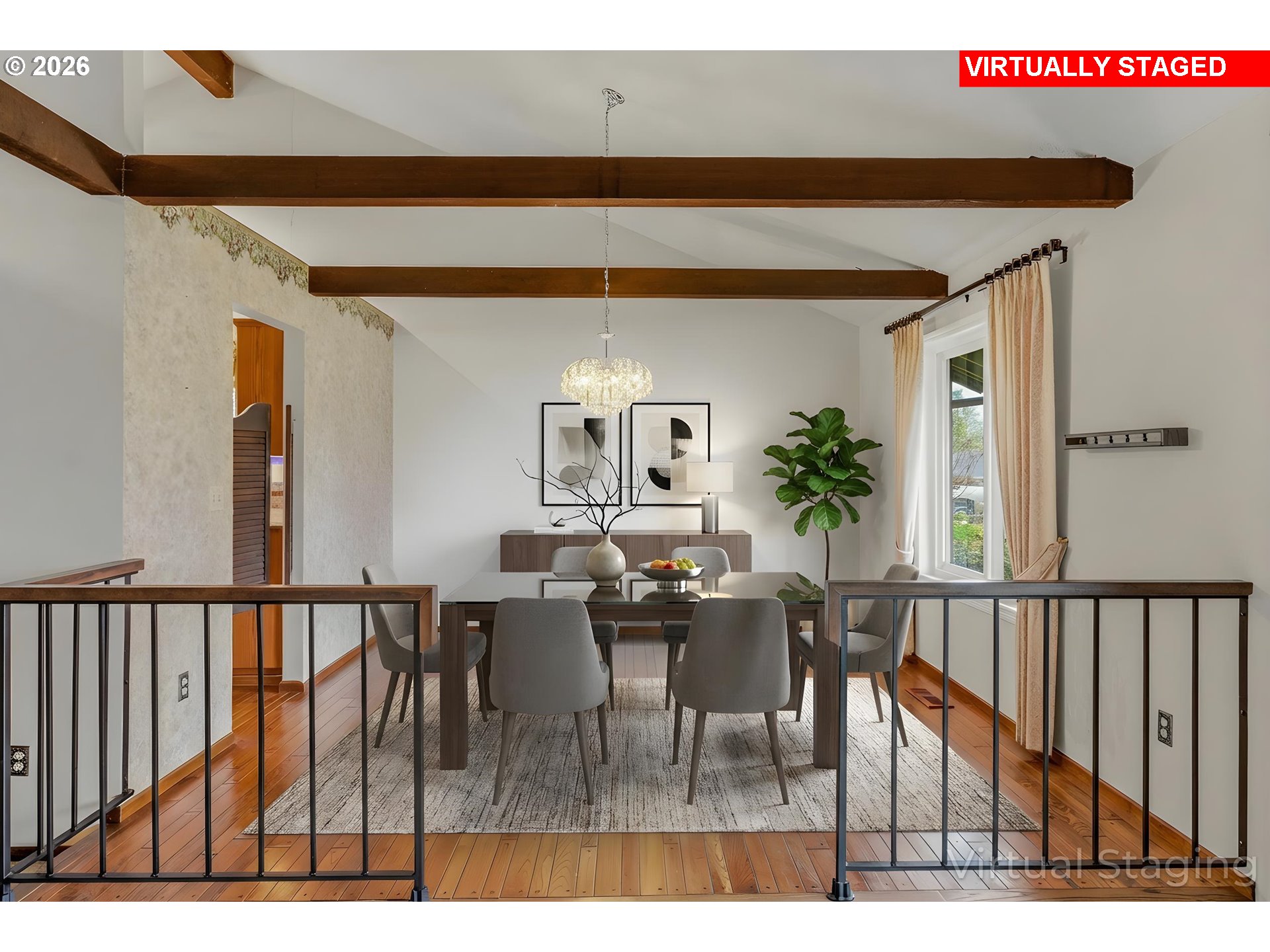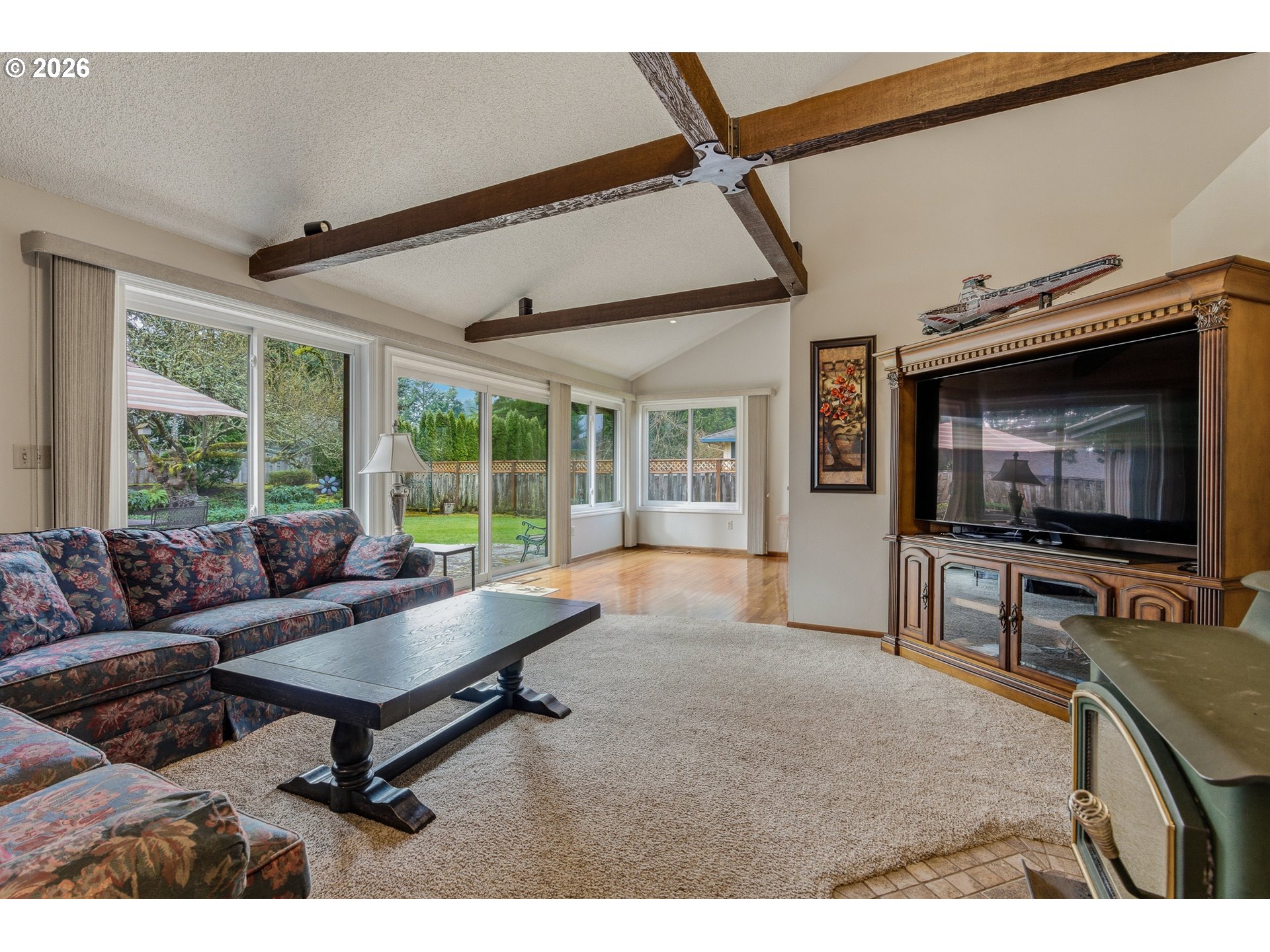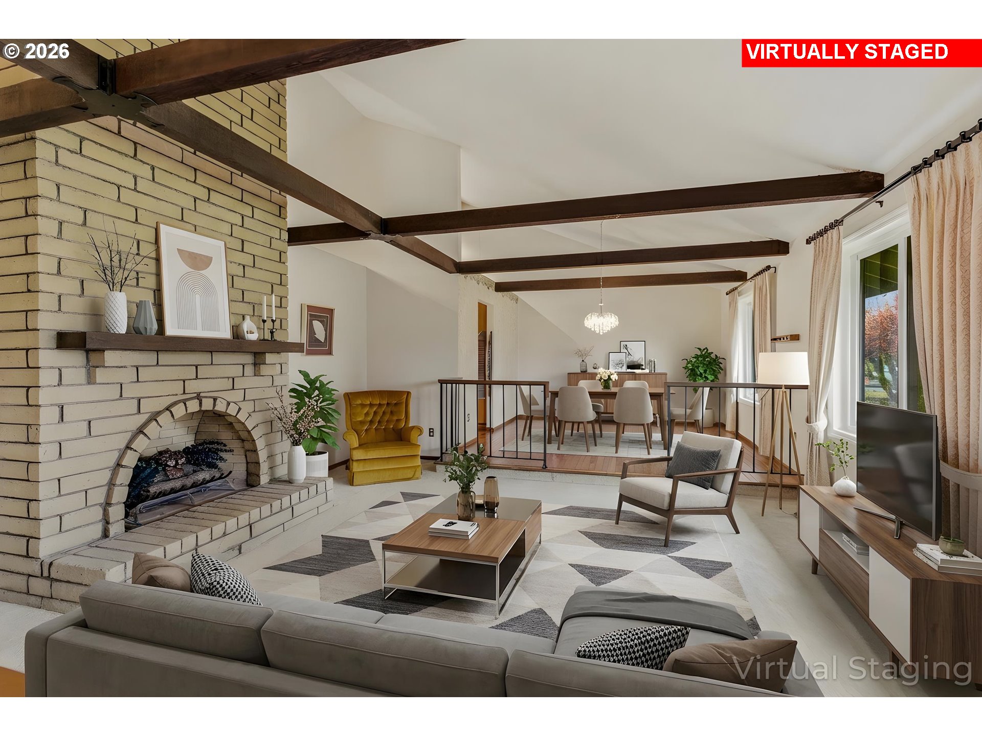 - Step into timeless charm in this 4 bed, 2 bath Beaverton home filled with character and warmth. A stunning double-door entry with stained glass welcomes you into a vaulted family room with exposed wood beams and a cozy fireplace, while a separate living room also features beams and its own fireplace for added ambiance. Wood floors run throughout most of the main level, connecting the formal dining room and a kitchen equipped with stainless steel appliances. All four bedrooms are on the main floor, including one set up as an office. The primary suite offers an updated en suite bath with a glass walk-in tiled shower and a private sliding door to the backyard. A hall bath serves the additional bedrooms. Upstairs you’ll find a large flex/bonus space plus an expansive loft with two beds for visitors and a deck overlooking the yard. Situated on a huge lot, the fully fenced backyard is a private retreat with mature landscaping, a garden area, tranquil koi pond, and a stone paver patio accessed by sliding doors—perfect for indoor-outdoor living. An attached two-car garage completes this truly special property.