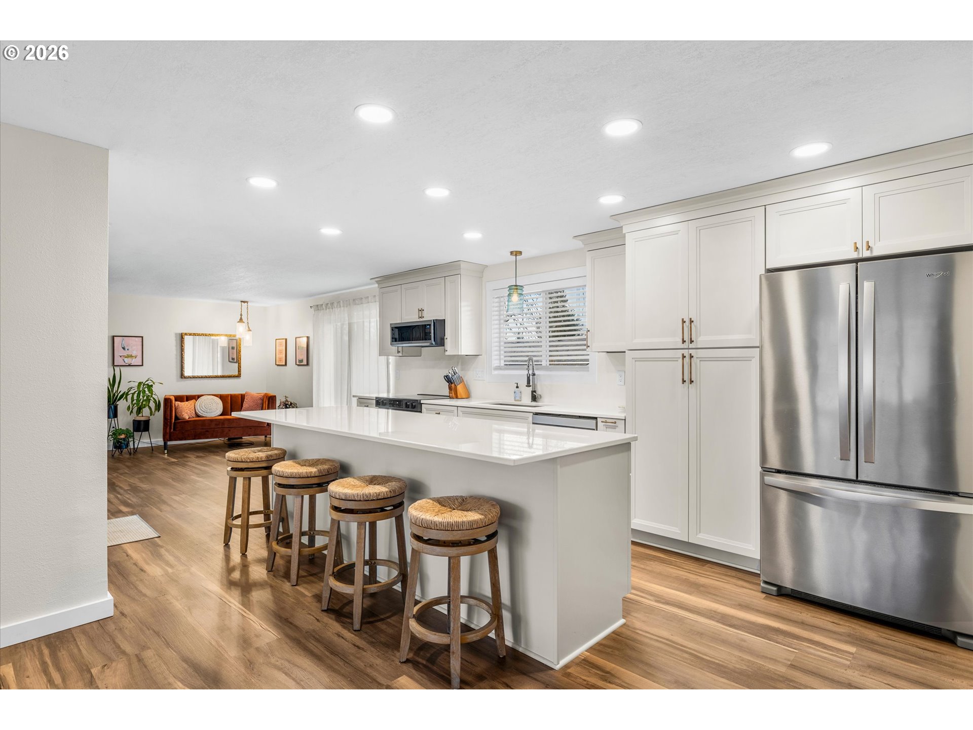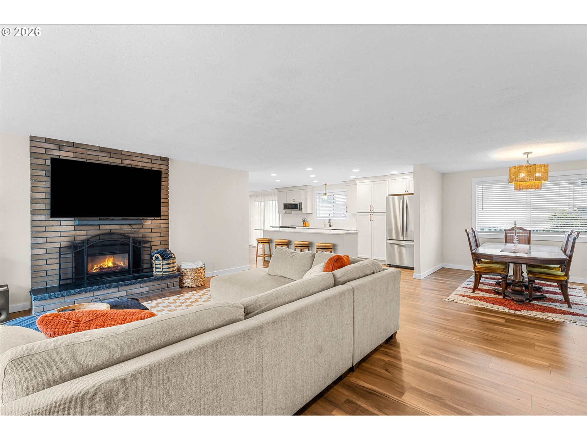 - Tucked away on a quiet cul-de-sac in the heart of Gladstone, this beautifully updated one-level balances mid-century charm with modern style and functional living. The open-concept living area serves as the centerpiece of the home, anchored by a brick fireplace and a striking kitchen island with gorgeous quartz slab countertops. The kitchen is fully equipped with newer stainless steel appliances, creating a space designed for effortless hosting.Thoughtful updates include new windows, a new sliding door to the backyard, new interior doors, new trim, new flooring throughout, new light fixtures, new window coverings and updated bathrooms. Outside, the large, fully fenced yard provides the perfect opportunity for recreation or gardening. A two-car garage and central air conditioning provide year-round comfort and convenience. Situated just moments from Gladstone High School, this is a rare, turn-key opportunity in a prime location.