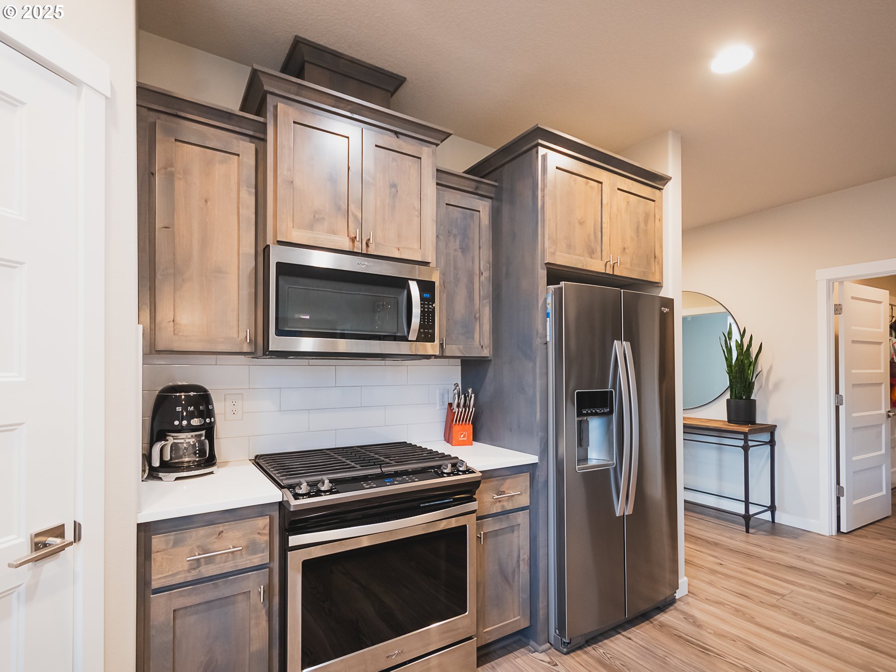 - Welcome to your dream home in Ridgefield!Built in 2020, this beautifully maintained residence offers desirable main-level living on a private corner lot. The open-concept floor plan showcases 9-foot ceilings, abundant natural light, and stylish modern finishes throughout.Enjoy a spacious great room with a cozy gas fireplace, perfect for relaxing or entertaining. The gourmet kitchen features an oversized island with quartz countertops, Energy Star stainless steel appliances, knotty alder cabinetry, brushed nickel hardware, and a convenient pantry — ideal for any home chef.The primary suite, located on the main floor, overlooks the peaceful backyard and includes a luxurious spa-inspired bath with a soaking tub and walk-in closet. You’ll also find a versatile den on the main level, perfect for a home office or guest space.Energy-efficient features include Energy Star HVAC and appliances, ensuring comfort and cost savings year-round.Located in an exceptionally quiet neighborhood, residents enjoy access to community parks and scenic walking trails that connect directly to downtown Ridgefield — combining the best of nature, convenience, and modern living.