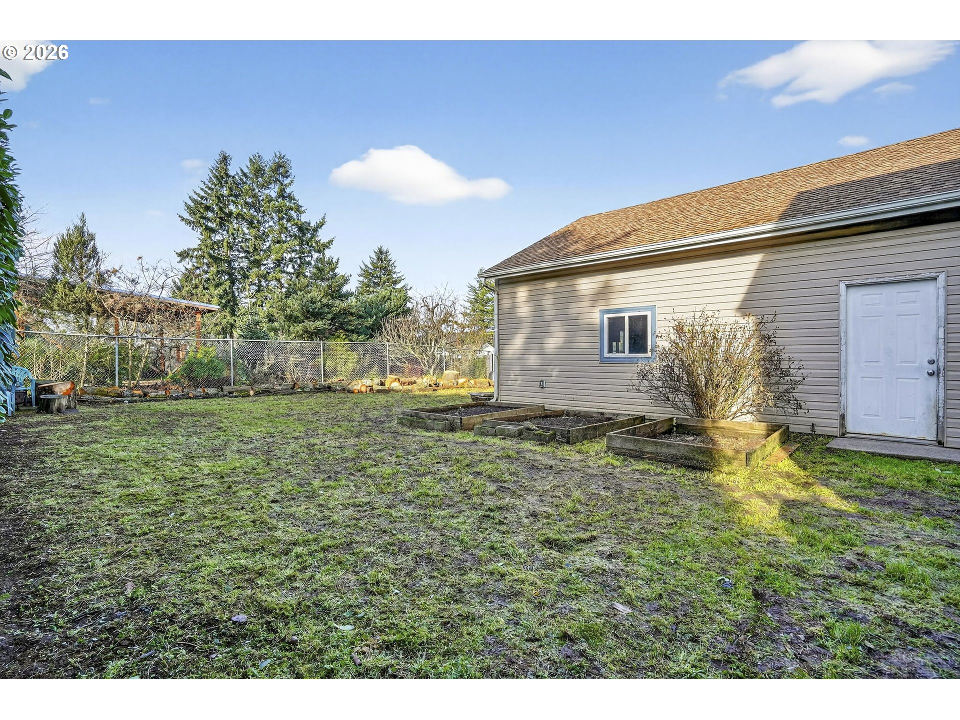- Deck, Fenced, Fire Pit, Garden, Public Road, Raised Beds, Yard
