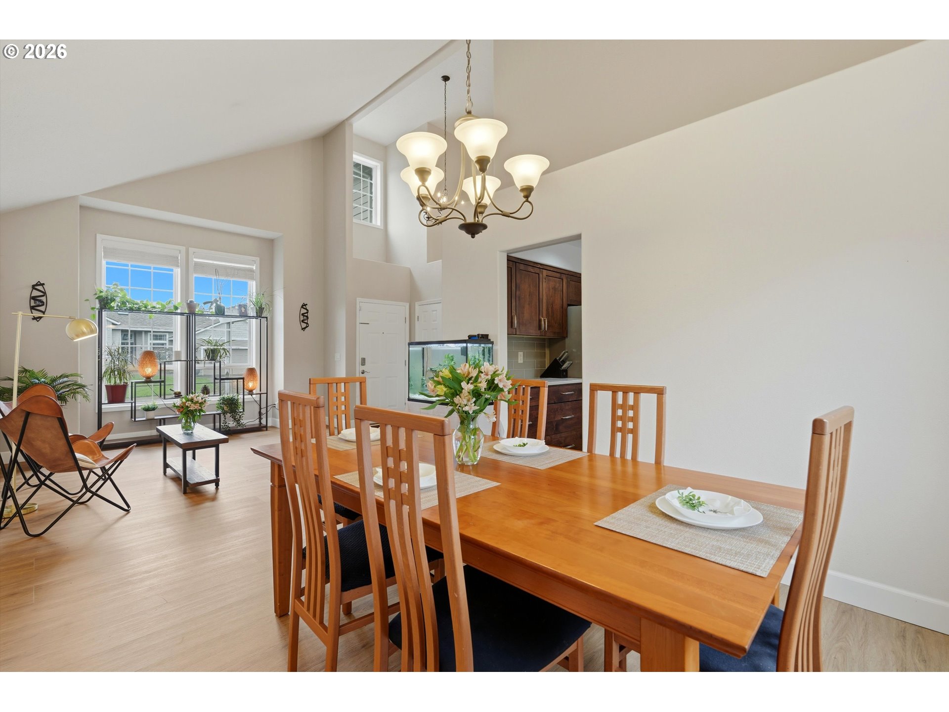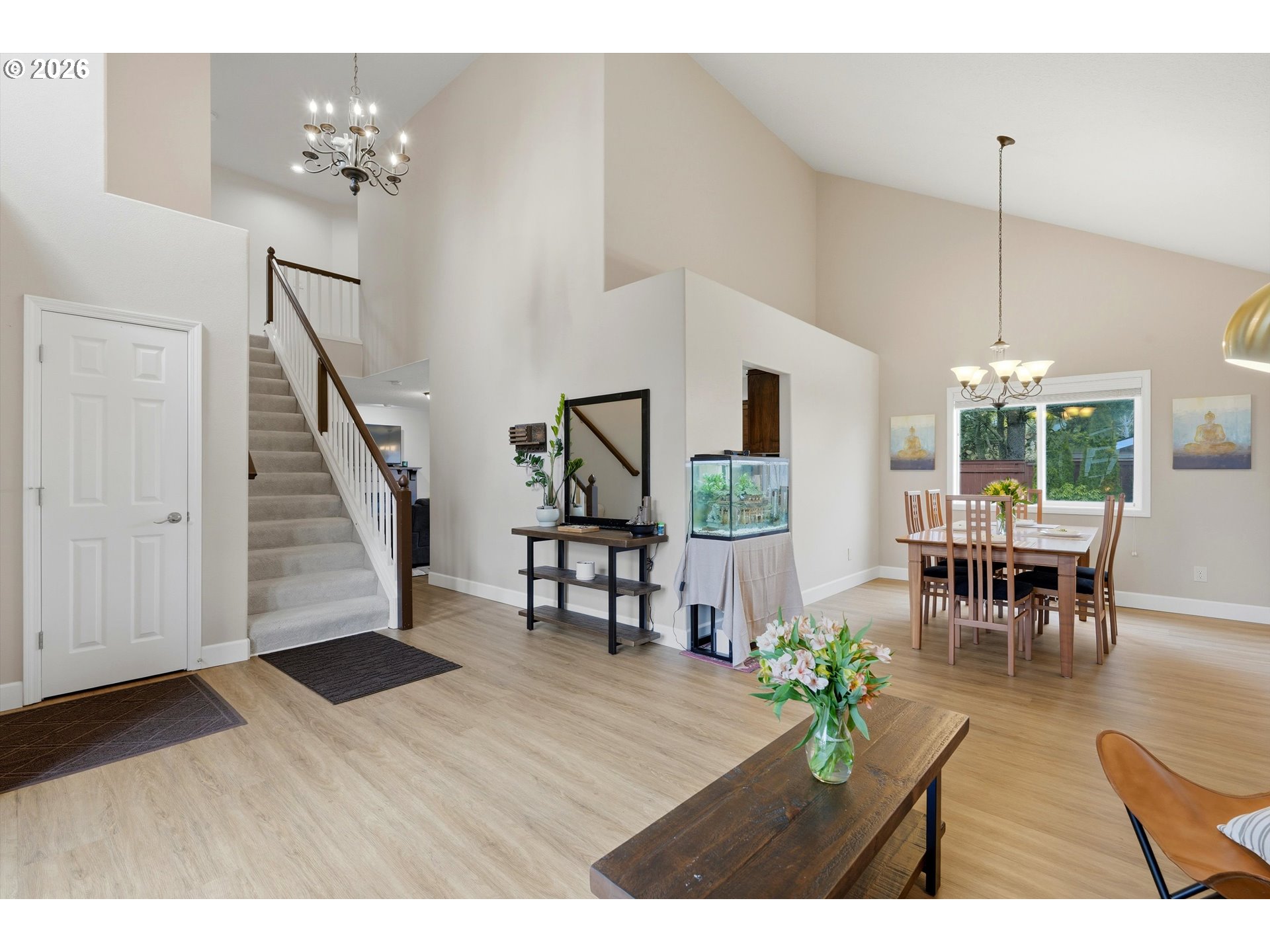 - Welcome home to easy living in the desirable Oregon Trail neighborhood. This conveniently located two-story traditional home features tasteful updates and a comfortable, flowing floor plan designed for everyday living and easy entertaining. Vaulted ceilings make this floor plan feel so light and spacious. Easy access to downtown, schools and shopping add to the convenience of this location.Beautiful luxury vinyl flooring offers both style and low-maintenance durability. Quartz countertops and custom cabinetry in the kitchen and bathrooms add a timeless, upscale touch. The kitchen is a true gathering space with an eat bar, charming breakfast nook, and formal dining room — all seamlessly connected to two spacious living areas with the kitchen at the heart of the home.Sliding doors off the family room open to a generous patio and beautifully maintained backyard, perfect for entertaining or relaxing outdoors.Upstairs, you’ll find three well-sized bedrooms and two additional full bathrooms. Generous room sizes and abundant storage throughout make this home as functional as it is inviting.A three-car garage provides flexible space for parking, hobbies, or extra storage. The professionally landscaped exterior features low-maintenance grounds, room for RV parking, and a versatile powered shed ideal for potting, woodworking, or additional storage.