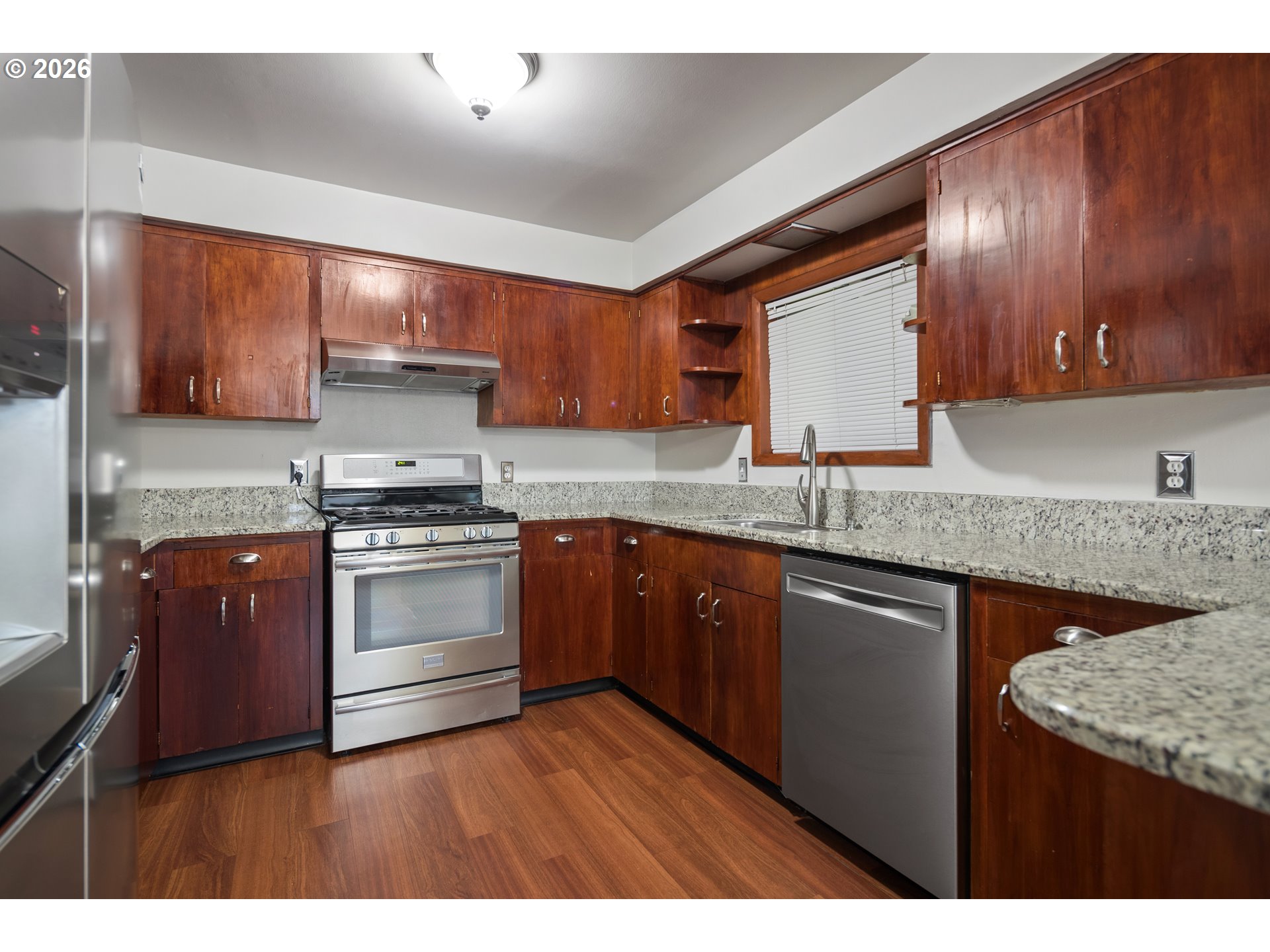 - Hardwood floors welcome you from the foyer and flow seamlessly through the great room and spare bedrooms, while the primary suite features brand-new carpet. The open great room offers built-ins and a cozy fireplace, creating an inviting space for everyday living and entertaining. The spacious kitchen boasts granite slab countertops, stainless steel appliances, and gas cooking, with laminate flooring that continues into the dining area. Enjoy exceptional outdoor living on the large covered patio. Additional highlights include an oversized two-car garage, newer roof, central air conditioning, and more—all in this well-maintained single-level home situated on a large, level lot with potential for RV parking