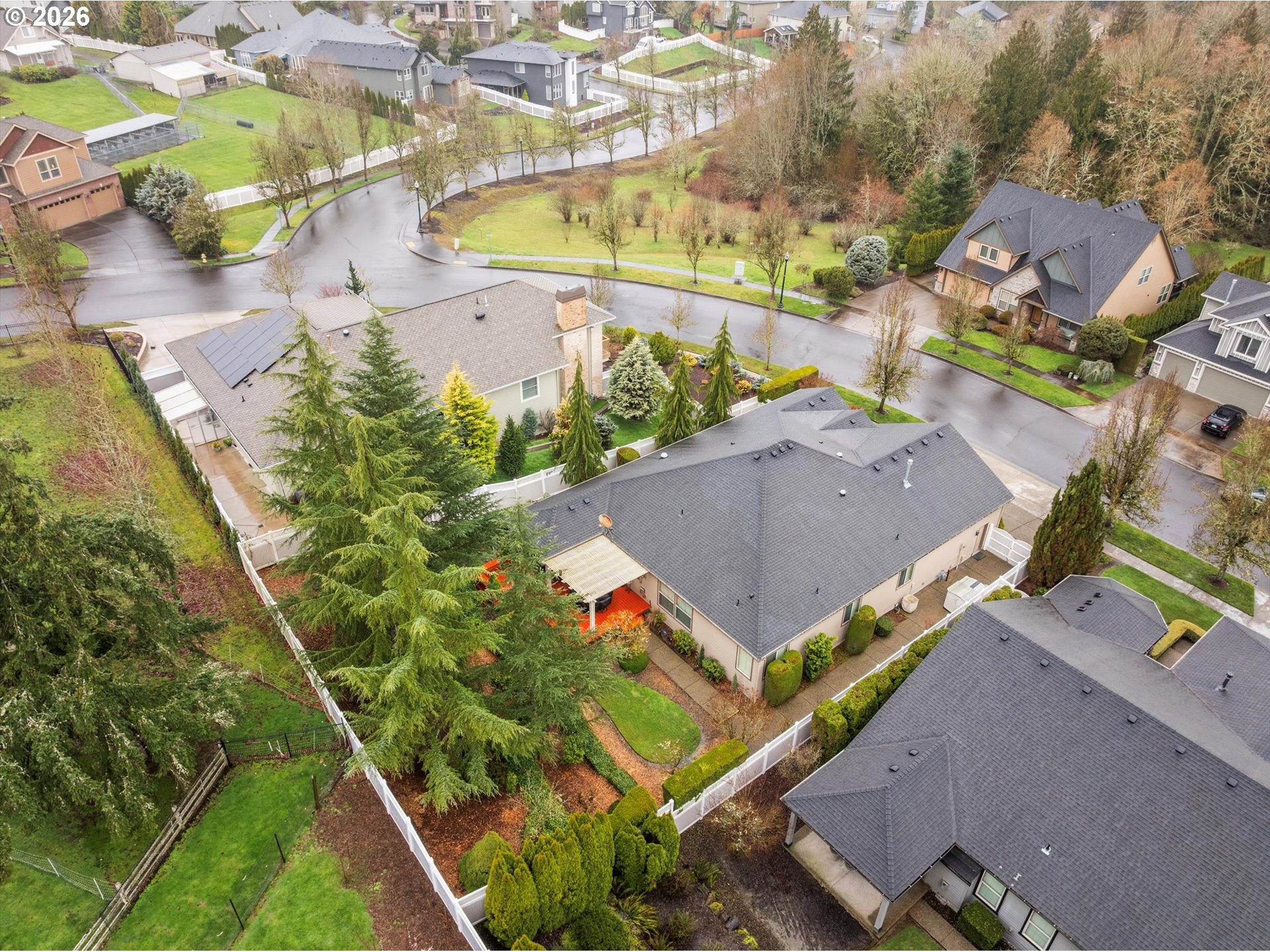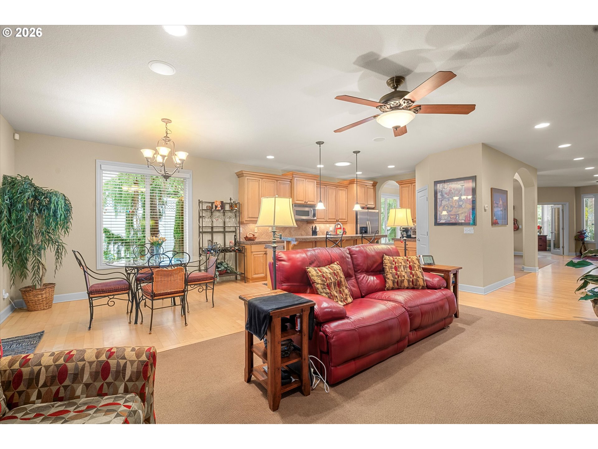 - Welcome home to beautiful Ridgefield! Where charm, quality, and community come together. Nestled in a highly desirable, established neighborhood of Cassini View, this stunning single level home offers timeless curb appeal and exceptional craftsmanship. Built with quality in mind, this home features an open concept layout designed for both everyday living and effortless entertaining. Take note of the high ceilings, real hardwood floors, custom cabinetry, whole house fan, huge attic storage space, wide hallways and front office with nature light! The spacious kitchen flows seamlessly into the main living and dining areas, with the gas fireplace w/variable fan creating a warm and inviting space for gatherings. The oversized primary suite is a true retreat, offering generous space including gorgeous en suite bathroom! The ample sized 3 car garage has plenty of room for storage and offers a workshop area for hobbyists. The outside retreat is sure to impress where over $100,000 has been invested, transforming it into an entertainer’s dream. The covered patio w/electric heaters, pond, irrigation, gas bbq hookup, shed with retractable roof and mature landscaping is a true escape! Whether you're hosting summer barbecues, relaxing under the stars, or enjoying quiet mornings, the backyard delivers both beauty and functionality. This is one level living at its finest in one of Ridgefield’s most sought after communities. Don’t miss the opportunity to call this exceptional property home!