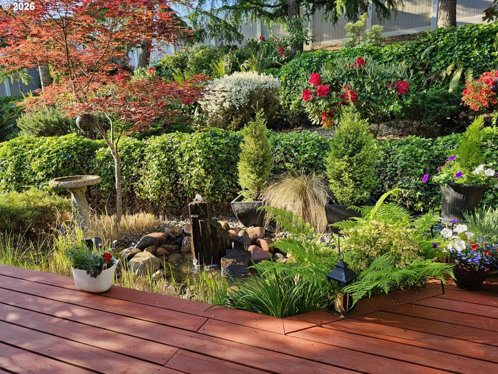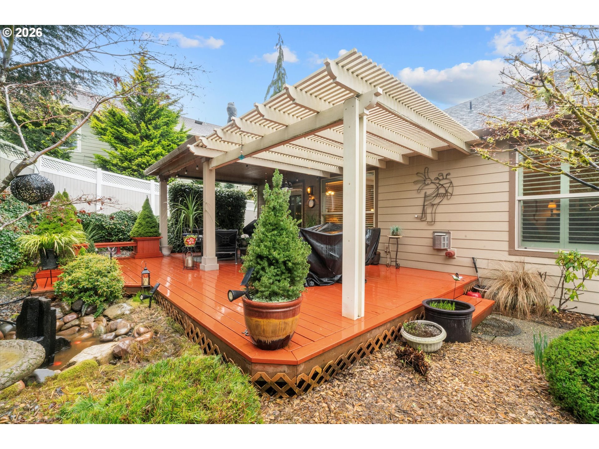 - Covered Deck, Fenced, Garden, Outbuilding, Patio, Sprinkler, Water Feature, Yard