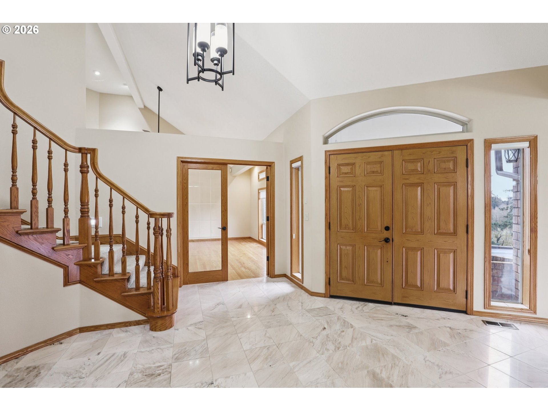 - Grand double-door entry with sidelites and radius transom opens to foyer featuring a half-turn staircase with oak balusters, accessory shelf, soaring ceiling. Formal living room is filled with natural light from view windows and clerestory windows, wood-burning fireplace with stone surround, flowing seamlessly into the formal dining room with built-in buffet cabinetry some with glass panes and convenient kitchen access. Great room family room showcases a beveled glass French door entry, wall of windows including clerestory windows, vaulted ceiling, and ceiling fan. Wet bar with granite countertops, built-in cabinetry, conveniently adjacent to family room and kitchen. Kitchen is equipped with a dishwasher, microwave, oven, Jenn-Air glass cooktop with downdraft, stainless refrigerator, granite counters, abundant cabinetry with pullouts, walk-in pantry, and desk area. Separate kitchen dining features a bay windowed wall, adjacent slider access to wrap-around deck. Main-level primary en-suite offers French door entry, walk-in closet, slider to deck, and recessed lighting, bath includes beveled glass French door entry, dual granite vanity, jet tub with tile surround, and shower. Upper level includes second and third bedrooms with walk-in closets and shared full bath with dual granite vanity and tub/shower combo. Bonus room/loft overlooks the family room. Main-level laundry/mud room with sink, shower, and built-ins, plus a powder room with granite vanity. Additional interior highlights include oak hardwood floors and interior doors, carpet, marble and ceramic tile floors, silhouette blinds, and central vacuum system. Exterior features include a fully landscaped, terraced, gated and block-walled yard with drive-in access, wrap-around deck, koi pond, mini fruit tree orchard, forested area with mature trees and edible mushrooms. An oversized, extra-deep 3-car garage with staircase entry into home. Mortgage savings may be available for buyers of this listing.