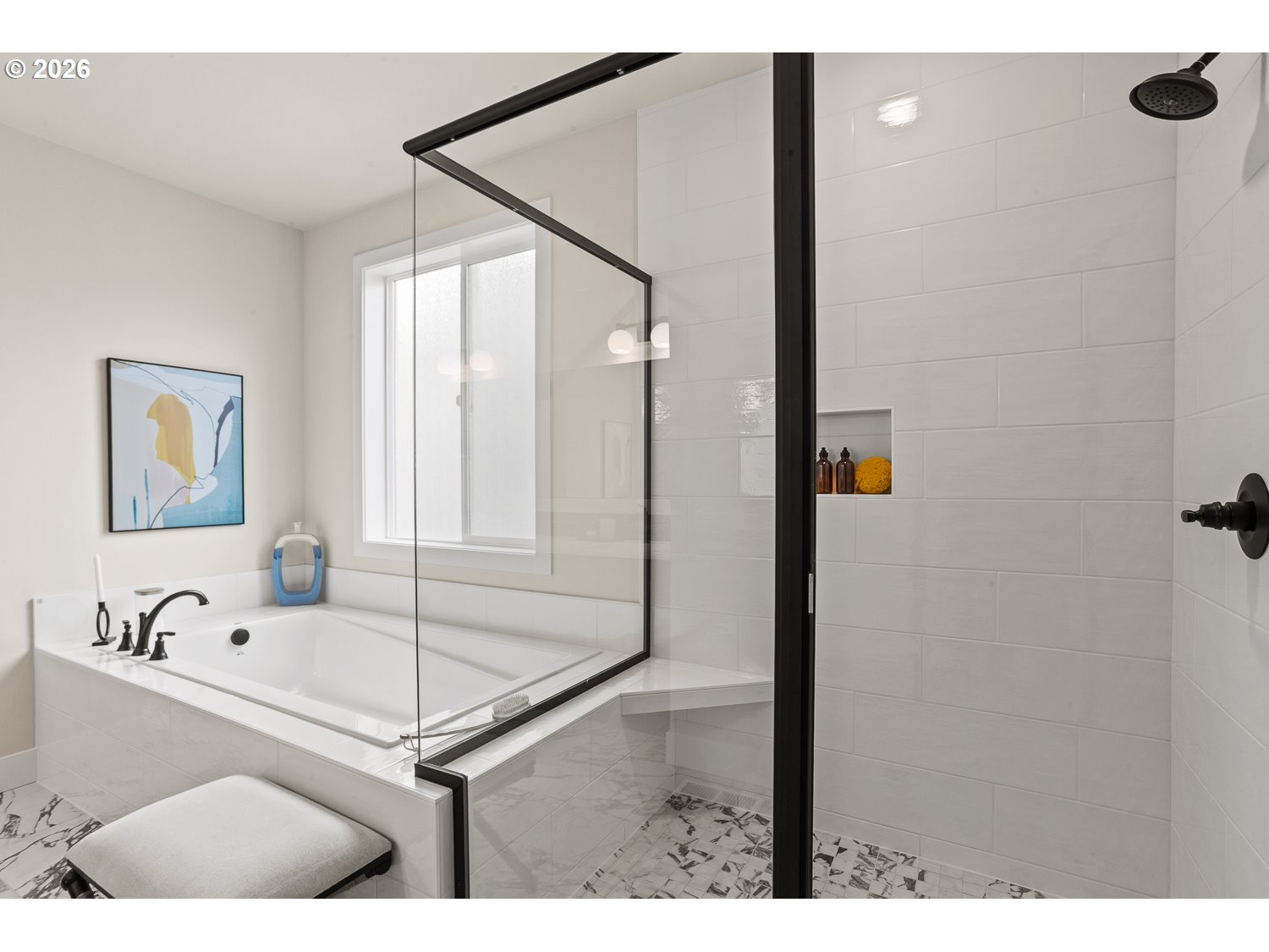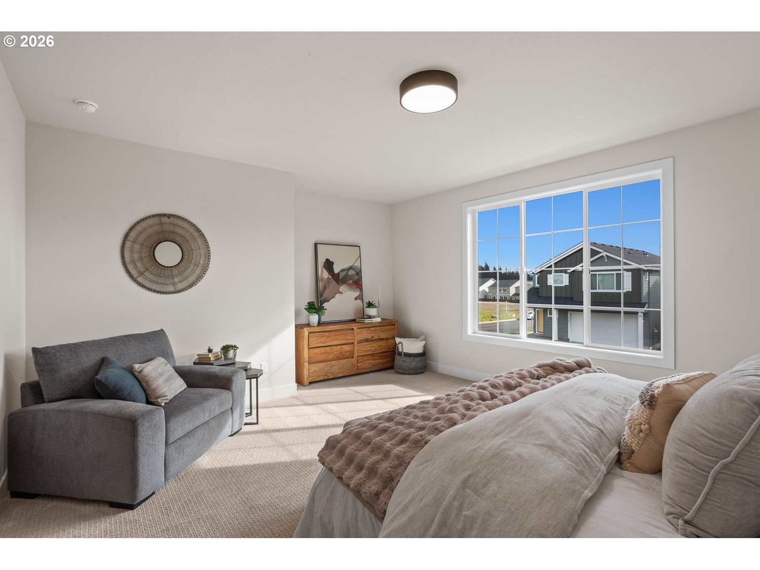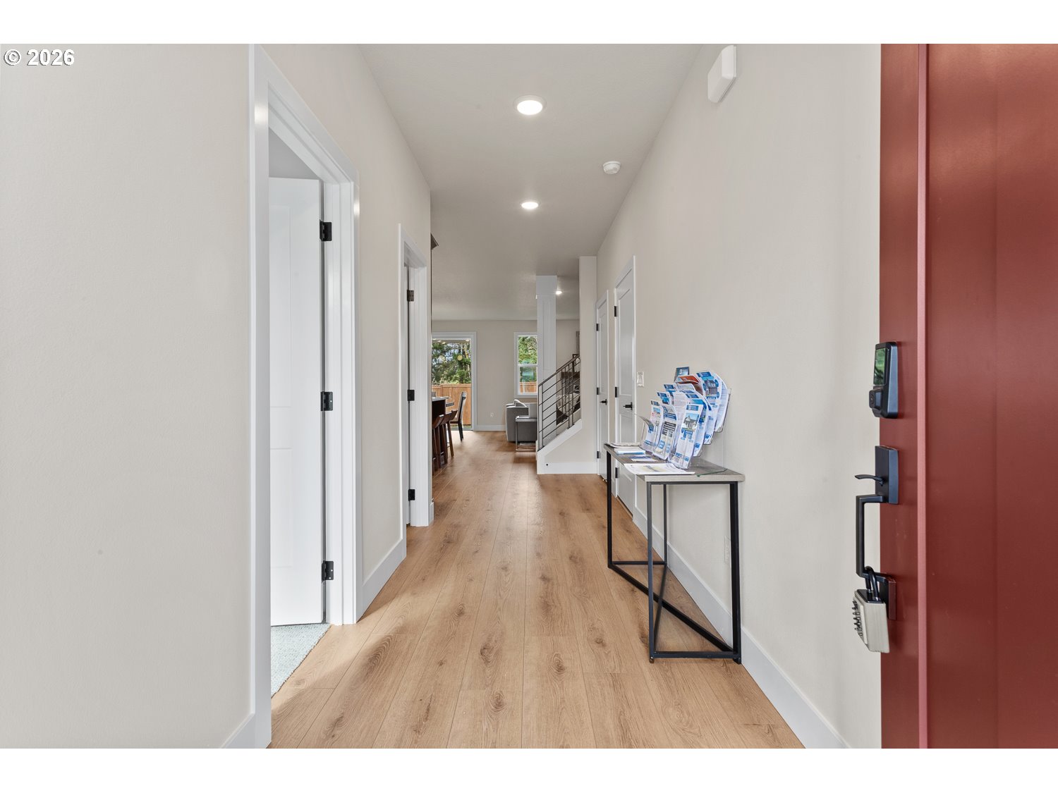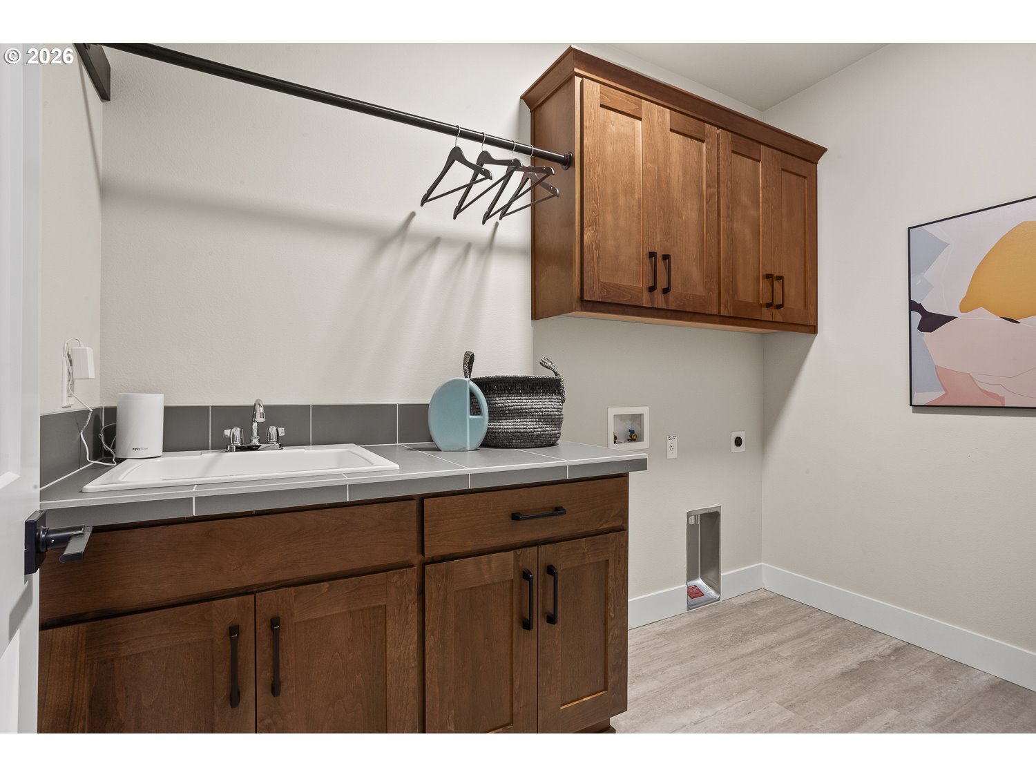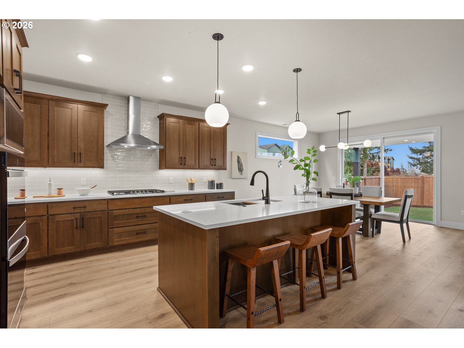 This open concept plan features alder espresso-stained mission cabinetry, slab quartz countertops w/undermount sinks in kitchen and bathrooms, gas fireplace in great room w/stained wood box beam mantel, and Whirlpool stainless steel appliances, including 5 burner gas cooktop, double wall oven and wall microwave, stainless steel tub dishwasher and chimney hood vent. Enjoy a roomy primary suite with a spacious walk-in closet and adjoining bath with all tile shower, soaking tub, and dual sink vanity. Front and rear landscaping, fenced with gate, sprinkler system on timer. Gasline for future BBQ! Earth Advantage Certified!