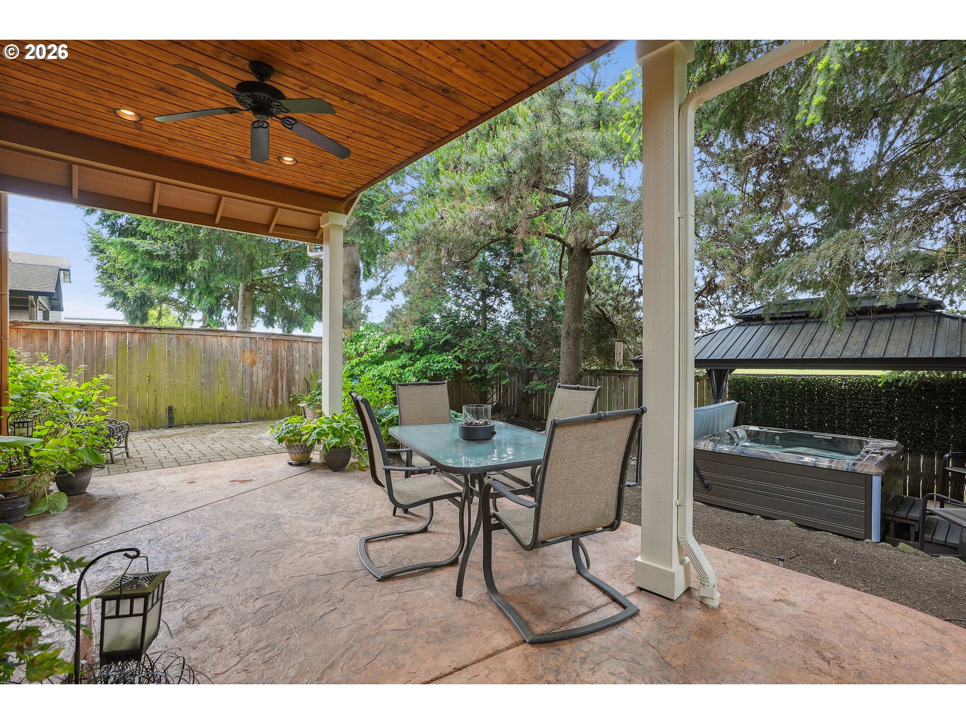 - Covered Patio, Fenced, Free-Standing Hot Tub, Gazebo, Patio, Porch, Raised Beds, Sprinkler, Yard