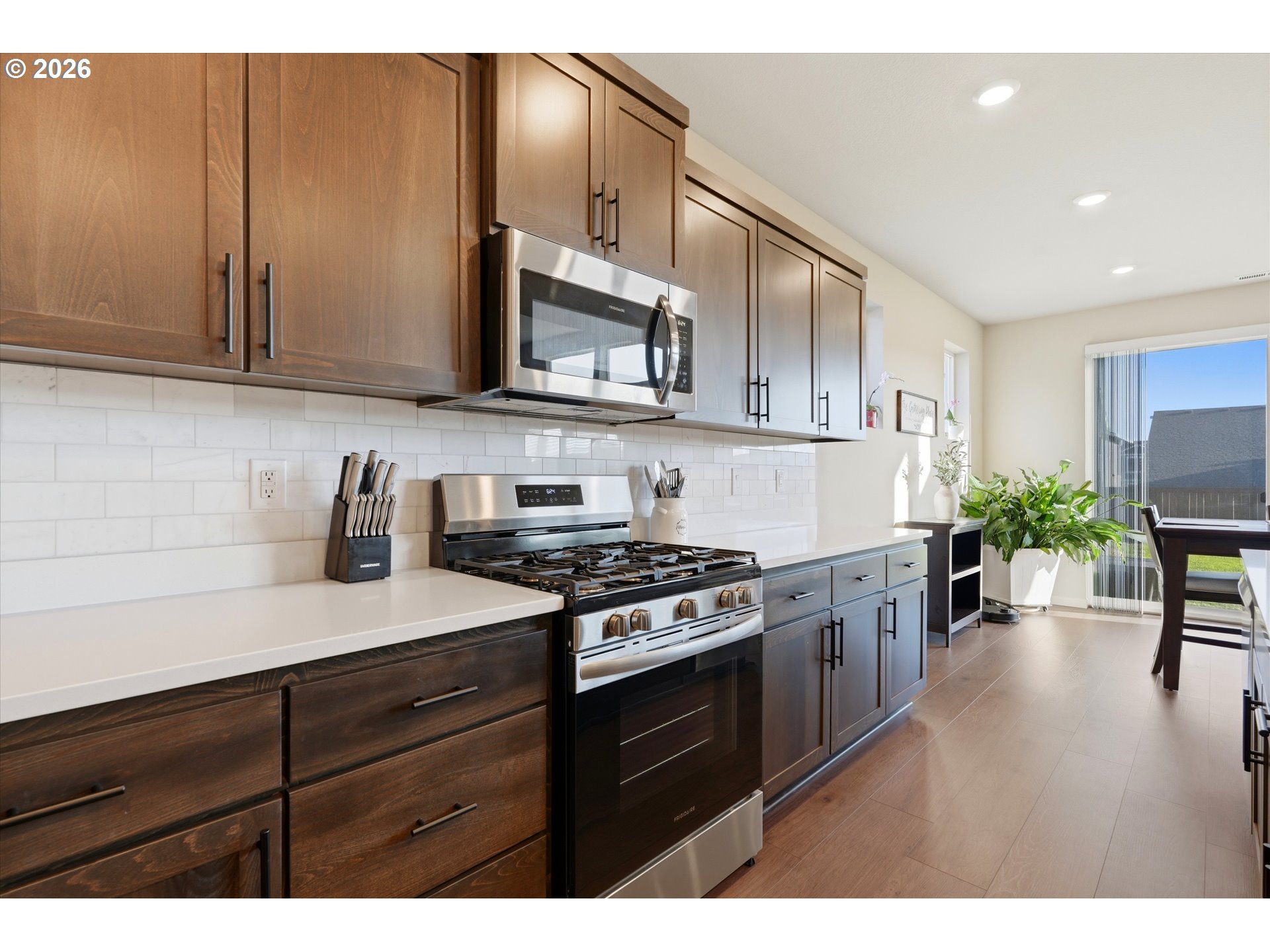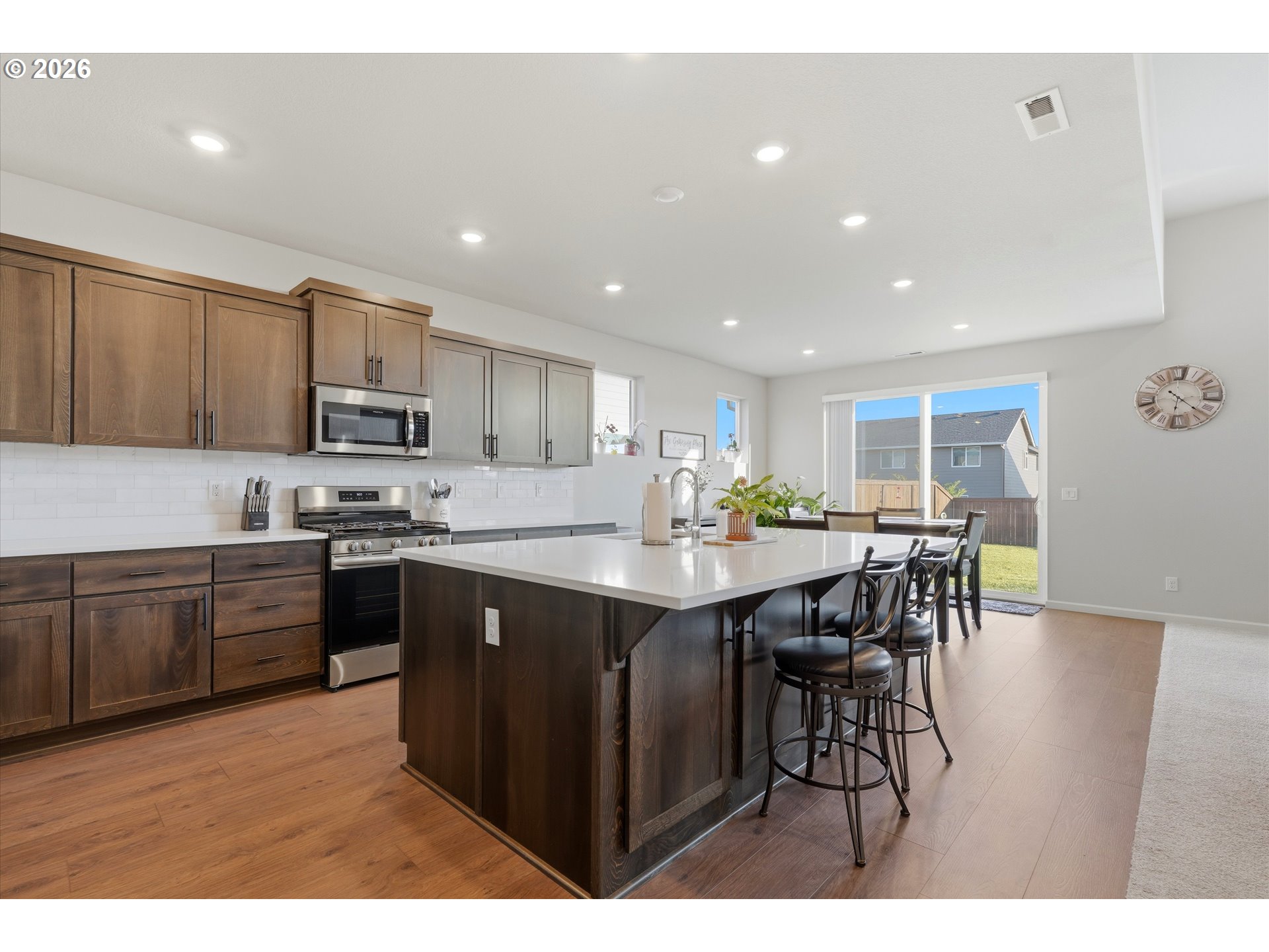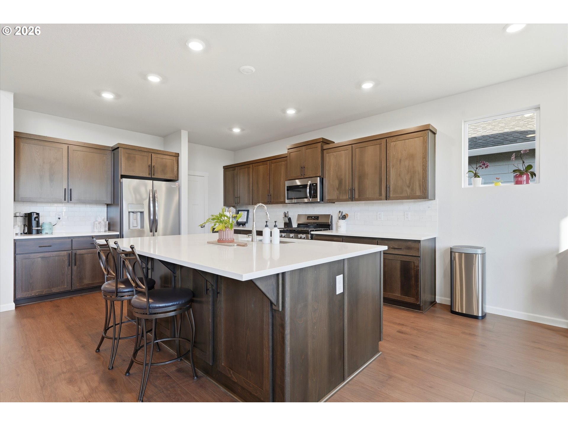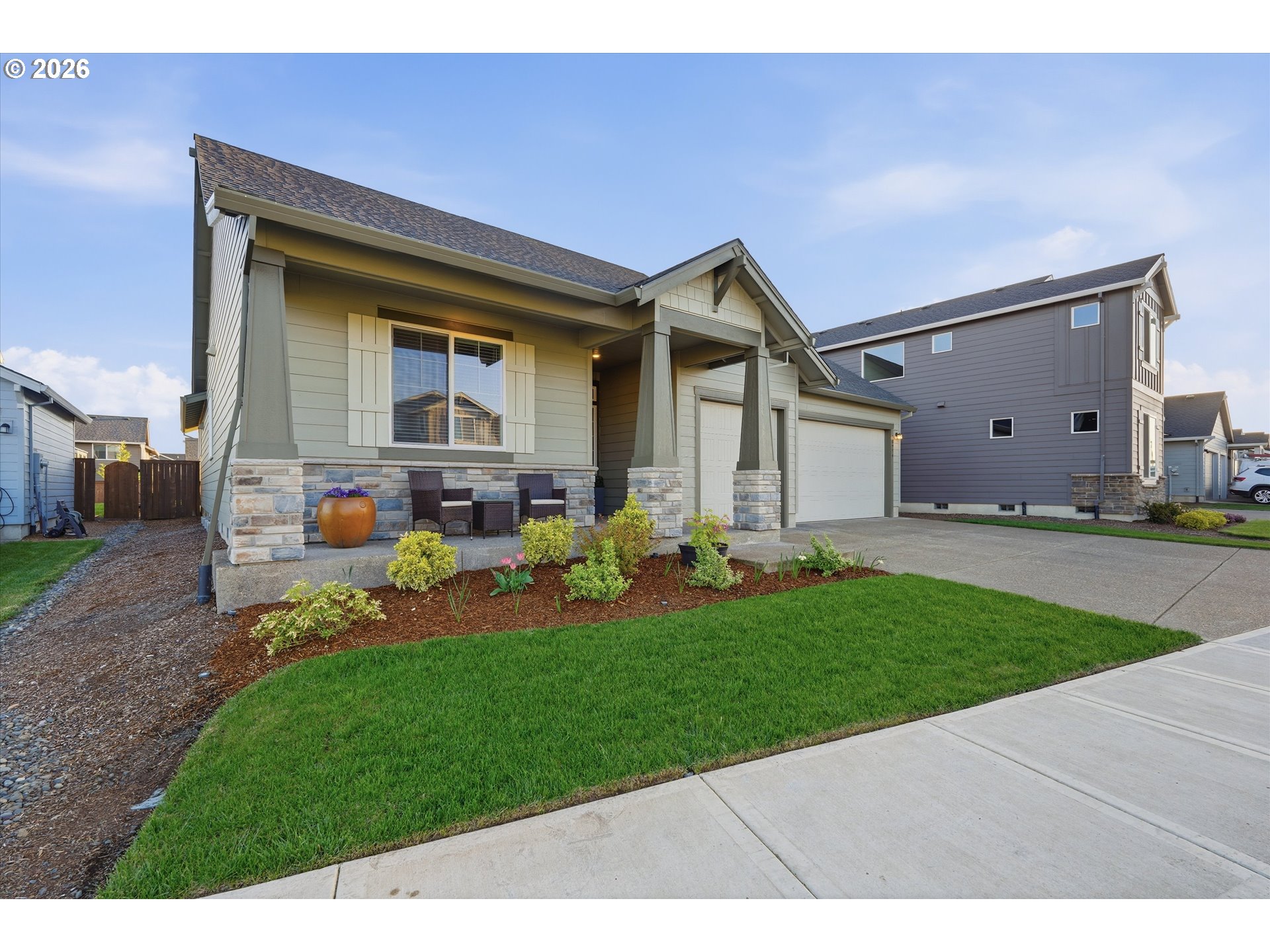 - Welcome to this beautifully designed 2023-built home in North Plains, offering the perfect blend of modern comfort, functionality, and style. Located in the highly desirable Brynhill community, this home is just moments from the elementary school, library, and numerous parks—making it an ideal setting for both convenience and everyday living. This single-level Deschutes floor plan features approximately 2,398 square feet of thoughtfully designed living space, with 3 bedrooms and 2.5 bathrooms. The open-concept layout seamlessly connects the kitchen, dining, and great room—creating an ideal space for both everyday living and entertaining. At the heart of the home, the oversized kitchen island with quartz countertops provides the perfect gathering space, complemented by abundant cabinetry and a clean, modern design. The great room is filled with natural light and enhanced by soaring 12-foot ceilings, giving the home a bright and spacious feel. The private primary suite offers a relaxing retreat, complete with a spa-like bathroom, quartz countertops, and a generous walk-in closet. Two additional bedrooms provide flexibility for guests, family, or a home office, while a dedicated office nook adds the perfect space for remote work, homework, or organization. Step outside to enjoy a large lot with an expansive backyard—perfect for entertaining, gardening, or simply unwinding. The 3-car garage adds convenience and extra storage, making this home as practical as it is beautiful.? Built in 2023, 3 bedrooms | 2.5 bathrooms, Approx. 2,398 sq ft, 3-car garage, Large lot + spacious backyard, Office nook / flex workspace, Open-concept living with 12’ ceilings. Located in a growing and vibrant community, this home offers the perfect balance of peaceful living with easy access to nearby amenities. This is a home that truly combines space, style, and comfort—ready for its next chapter.