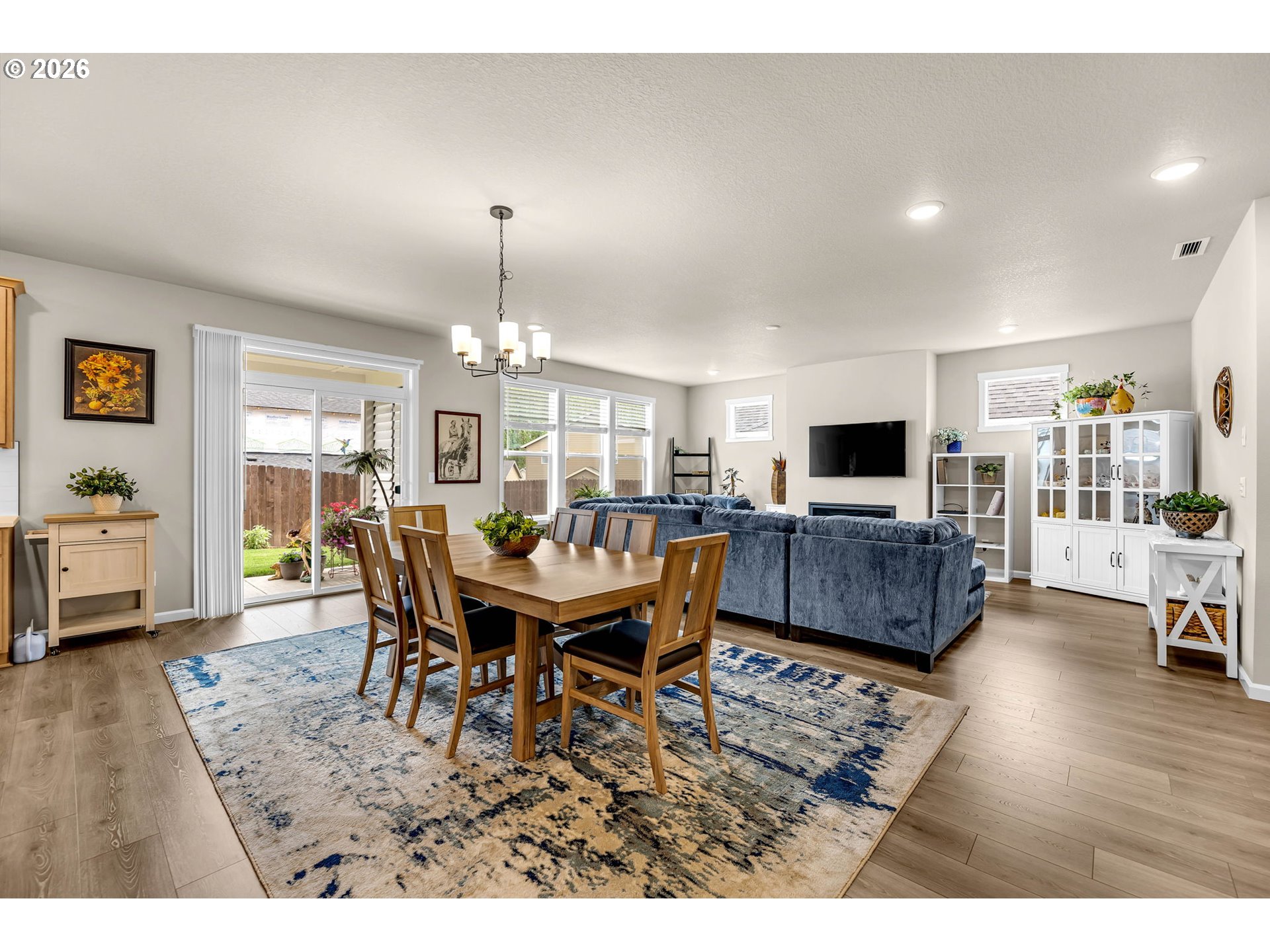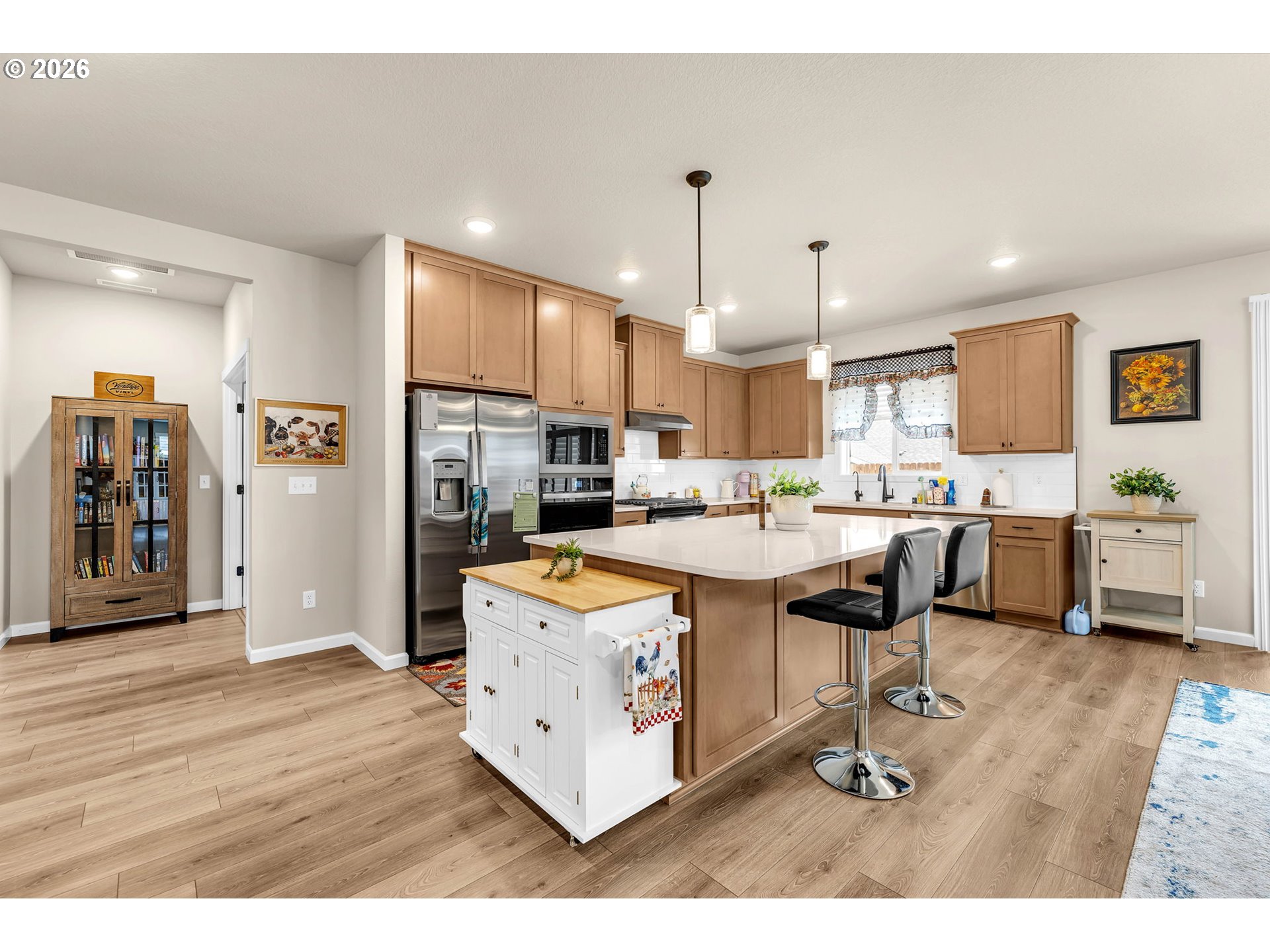 - Stylish, Spacious Single-Level Living with Premium Upgrades!This beautifully designed 4-bedroom home delivers the perfect blend of efficiency, comfort, and upscale finishes, all on one level. Featuring a rare 3-car garage and an expansive covered patio, this property is built for both everyday living and effortless entertaining. Inside, enjoy 9-foot ceilings, durable laminate plank flooring, and an open-concept layout centered around a sleek linear gas fireplace. The chef’s kitchen stands out with quartz slab countertops, full-height subway tile backsplash, stained cabinetry, under-cabinet and pendant lighting, and stainless steel gas appliances with a built-in wall oven. Recent upgrades include a top-tier Culligan water softener, enhancing long-term system performance and water quality. Bathrooms feature tile flooring, while the primary suite offers a spa-inspired retreat with a tiled walk-in shower. Additional highlights include a functional laundry room with sink and cabinetry, plus a fully landscaped backyard with plantation shutters for added privacy. Low-maintenance, high-comfort living homes like this don’t sit long. Schedule your showing today.