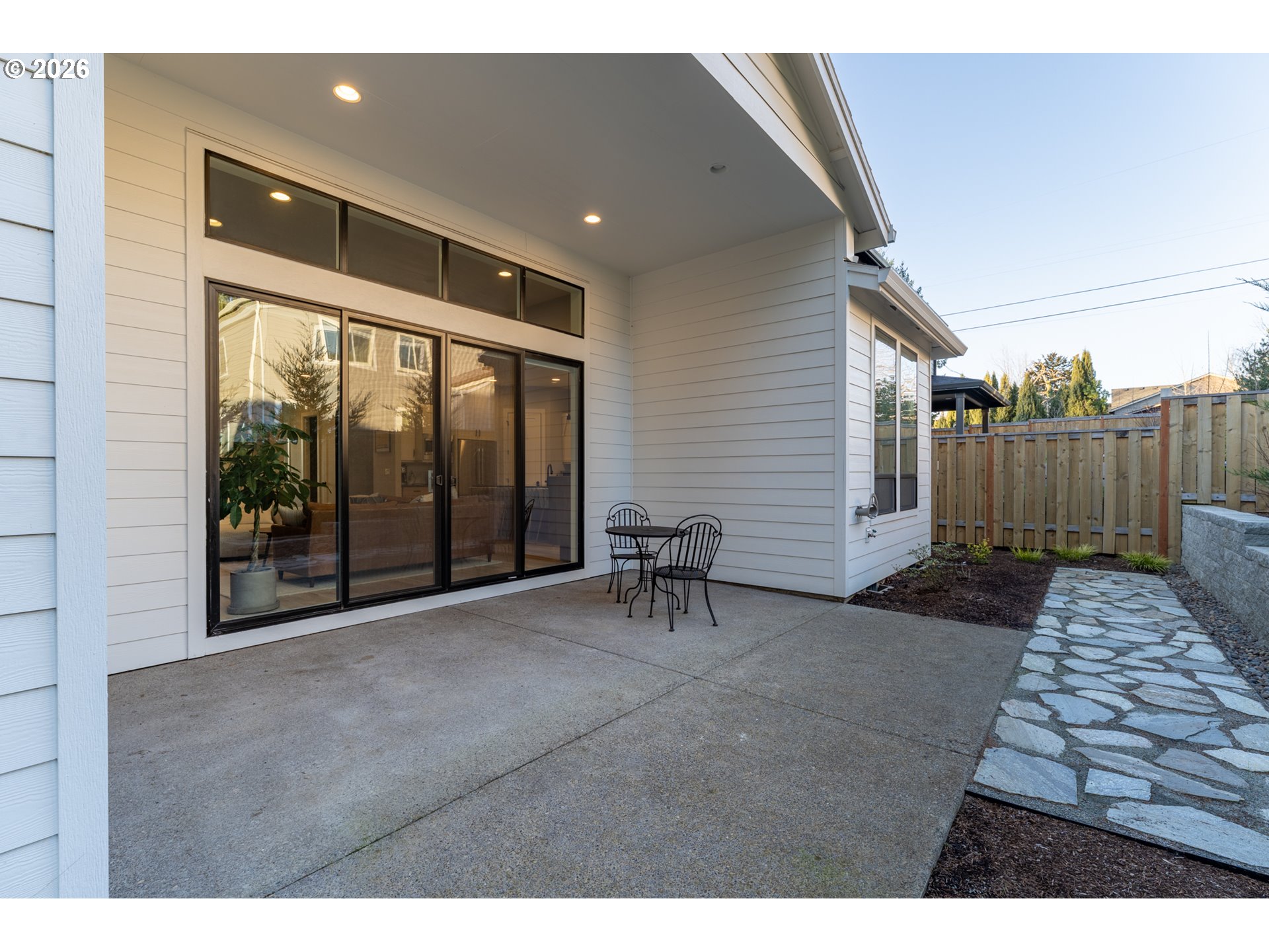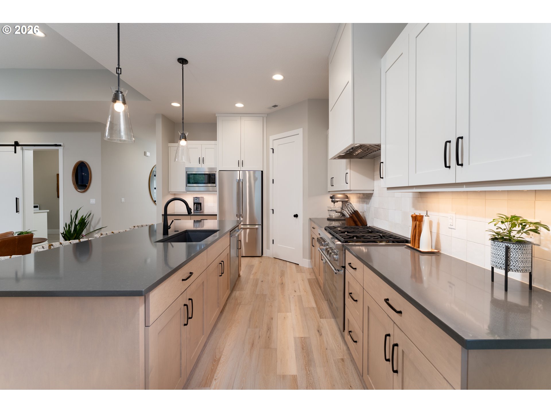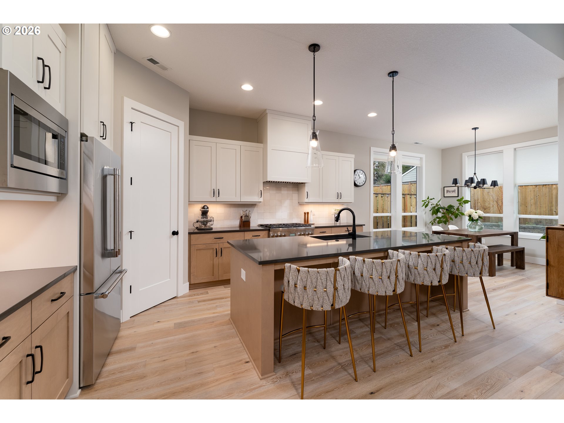- Modern Contemporary Farmhouse situated in the heart of Garden Home. Garden Terrace is an 8-lot development on a dead end street blocks to Trader Joes, Old Market Pub, Fanno Creek Trail, and Moonshadow Park with easy access to Multnomah Village and Washington Square. Completed in 2023 by Westwood Homes and loaded with architectural details and designer finishes, this home has been lightly-lived in, well-cared for and clean as a whistle. Interior finishes include engineered hardwood and tile floors, custom cabinetry, automatic and room darkening window treatments. The main level primary suite includes 10-foot ceilings, dual vanities, soak tub, separate glass/tile shower & large walk-in closet. The kitchen includes quartz counters and island, Thermador appliances including 36-inch (6 burner) gas range with integrated range hood and large pantry. The great room has 12-foot ceilings, gas fireplace, open shelving with additional built-ins. Generous den with large closet and additional small storage area. Utility/mud room with folding shelf, barn door and boot/coat bench and hooks. The upper level includes two bedrooms, full bath and additional 4th bedroom or bonus room. Two-car garage with additional space ideal for shop, work bench or exercise space. Exterior amenities includes a low maintenance grounds, fenced yard, covered patio plumbed with gas. Recent improvement and updates include a new front yard and landscape, rear flagstone path and landscape, second fence gate, garage sink and extra hose bib. Ultra quiet and close-knit community with Washington County Taxes. Seller is licensed real estate broker in the State of Oregon.