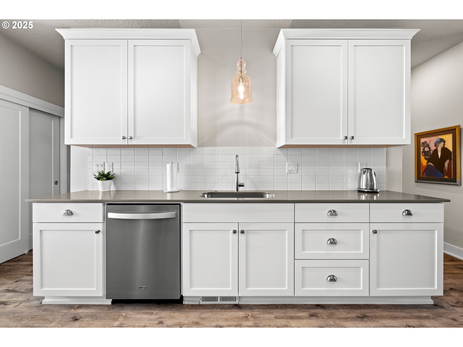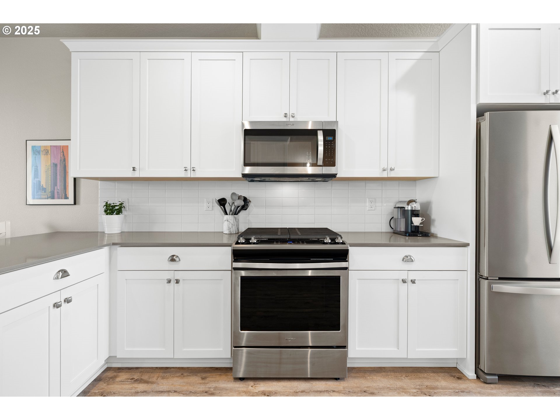 - Experience luxury living in this stunning townhouse, set in a peaceful, private location that backs to greenspace—perfect for nature lovers. Enjoy nearby walking trails while still being close to everyday conveniences. Built by West Hills Homes, a high-performance builder known for energy efficiency, this one-owner residence reflects pride of ownership and exceptional care. With its southwest exposure, the home enjoys soft morning light in back and warm afternoon sun in front. The living area overlooks the greenery and features luxury vinyl flooring that flows into the thoughtfully designed kitchen with quartz countertops, Whirlpool Gold Series appliances, white soft-close cabinetry, a peninsula bar, and a spacious pantry. The owner’s suite, filled with morning light, offers a walk-in closet and private bath w/dual sinks and quartz countertops. A large second bedroom works well as a guest room or office, with laundry conveniently placed between both bedrooms. The expansive 2-car tandem garage includes direct access to the fenced yard and patio, EV-outlet, and a WiFi-enabled opener. A private composite deck with metal railing overlooks the greenspace for seamless indoor-outdoor living. Additional features include modern colors, top-down/bottom-up shades, ceiling-fan rated junction boxes, and a zoned ducted heat pump for year-round comfort. Near Progress Ridge and Murrayhill, this home offers easy access to shops, dining, and entertainment, plus top-rated schools—Scholls Heights Elementary, Conestoga Middle, and Mountainside High.