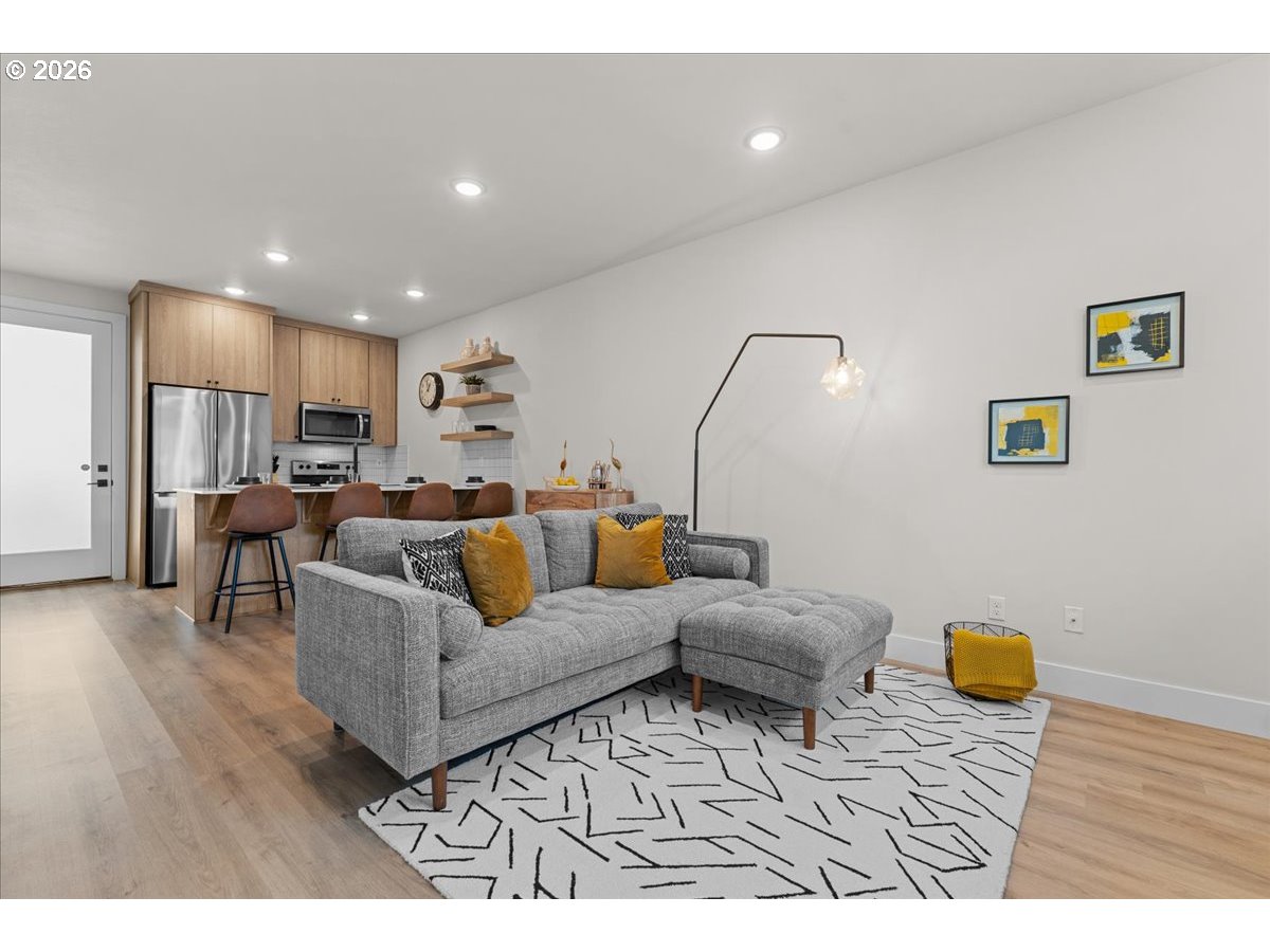 - Modern style meets a great SE location—NO condo, NO HOA. This home features clean modern architecture, neutral tones, and an open-concept layout that feels bright and inviting. The primary bedroom includes an ensuite bath with tub/shower, plus a second full bath for guests and the second bedroom. Upstairs laundry makes life easy, with washer and dryer included. The kitchen has sleek tile, floating shelves, and SS fridge included. Air conditioning keeps things comfortable year-round. Just enough backyard space to make it your own! Steps from Mt. Scott Community Park and around the corner from Woodstock, with plenty of shopping, dining, and everyday conveniences nearby. Truly move in ready, schedule your private showing today! [Home Energy Score = 9. HES Report at https://rpt.greenbuildingregistry.com/hes/OR10244137]