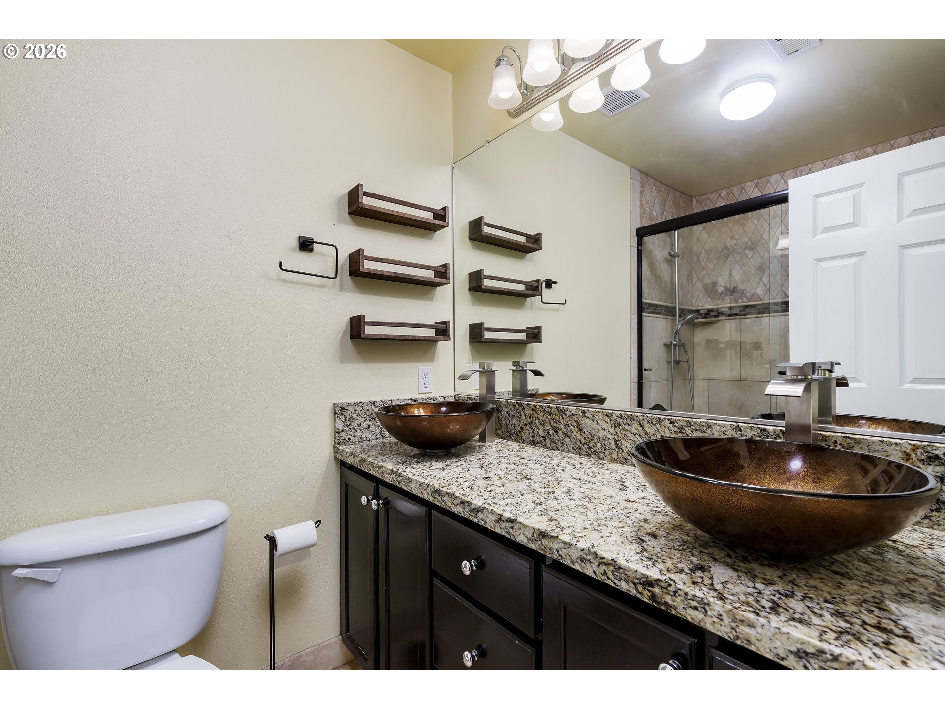 This move-in-ready townhouse features 4 bedrooms and 3 Full + 1 half bathrooms, including a private lower-level bedroom with its own bathroom, closet, and direct access to the backyard—ideal for guests, multigenerational living, bonus room or a home office. The home is situated in a quiet part of the neighborhood and backs to a tree-lined green space, offering exceptional privacy and a peaceful setting. The main level showcases hardwood floors throughout and an open-concept design with large living room, dining room and kitchen with nook. The kitchen includes stainless steel appliances, an island with an eating bar, built ins, an included refrigerator and a slider from nook area leading to the deck and staircase, providing easy access to the lower patio. Additional highlights include vaulted ceilings, a skylight, and electronic blackout shades in the living room. The oversized garage offers an 8-foot door height and a storage closet. The roof, air conditioning, and carpet are newer Great location! Enjoy easy access to nearby parks, shopping, everyday amenities, medical services, and quick commutes via I-5 and I-205.This home is truly move-in ready!