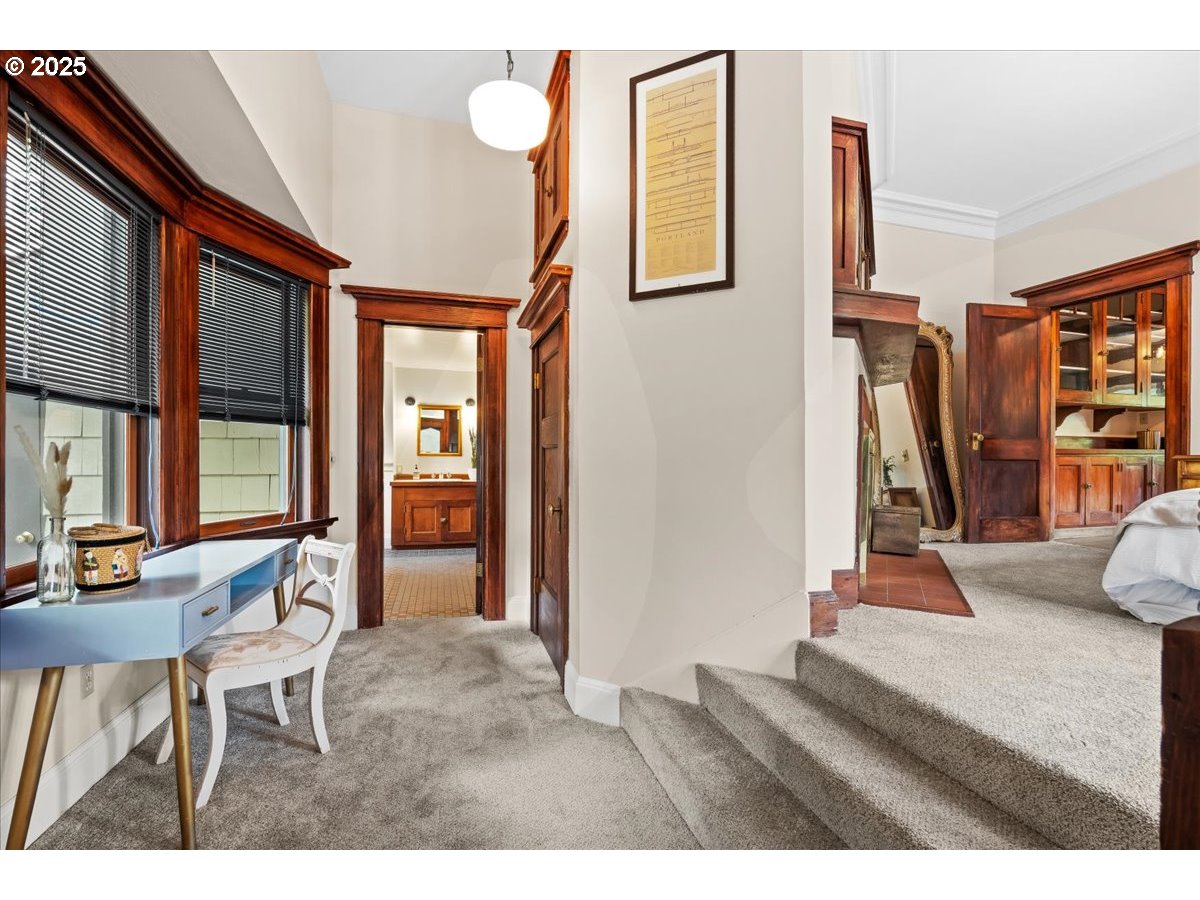 - Open House Sun 12/14 from 2-4! This one of a kind home rarely comes up in Portland! Your opportunity to own a piece of architectural history in the heart of NW Portland. A ground level unit in the historic Sanborn house, a stately converted mansion with beautiful landscaping and a grand covered front porch. The architects for this house were Bennes, Hendricks & Tobey. William Tobey was the architect for a few houses of the same era in this neighborhood. This 4-plex was restored and converted in the late 70’s by local developer Chris Prospect who had a passion for restoring gorgeous old Portland homes. You will find stunning architectural details like the oval- tiffany-esc rodando stained glass skylight in the entry, classic millwork throughout, large picture windows, hardwood floors, 2 wood burning fireplaces, beautiful craftsman door hardware, light fixtures and more. The living room has a stained glass door out to a private and sunny patio. The bedroom features period details, ample natural light, and a custom built-ins around the fireplace. There is a separate office nook space off the spacious bathroom. The vintage tile-work in the bathroom complements the historic aesthetic and features an old safe that shows signs of the historical past. This ground level home has minimal steps and direct access to a side door that goes out to the parking area. Each unit has their own basement storage space with so much potential for additional usable space. (total square footage includes basement space). Additional features include newer water heater, new carpet and paint, central air conditioning and a private washer and dryer. Located just blocks from the shops, restaurants, and cafés of the vibrant NW 23rd Avenue district, this location offers the best of Portland living just steps from your front door. Whether you're looking for walkable convenience, timeless architecture, or a truly special place to call home—this condo offers it all. [Home Energy Score = 9. HES Report at https://rpt.greenbuildingregistry.com/hes/OR10238008]