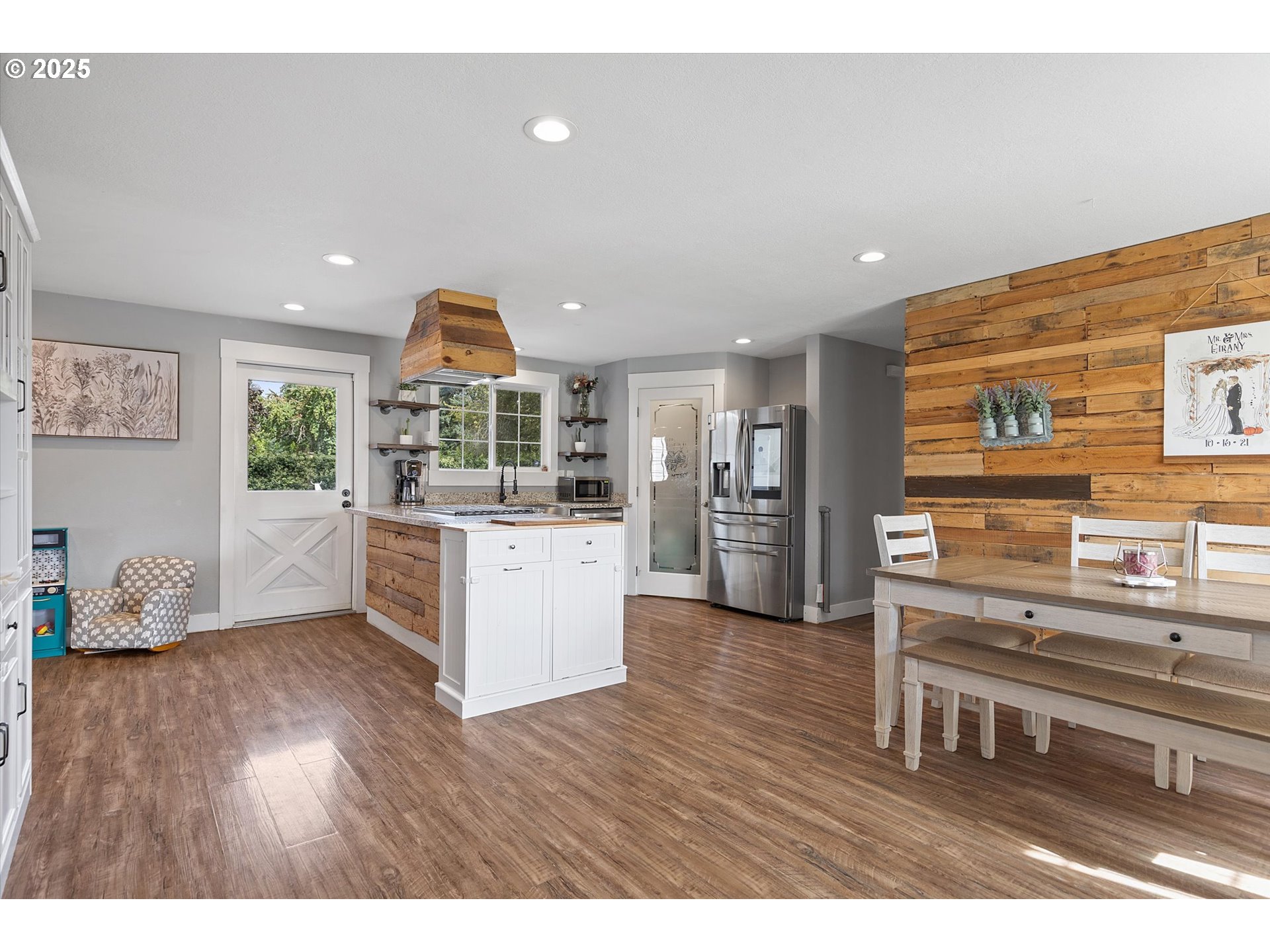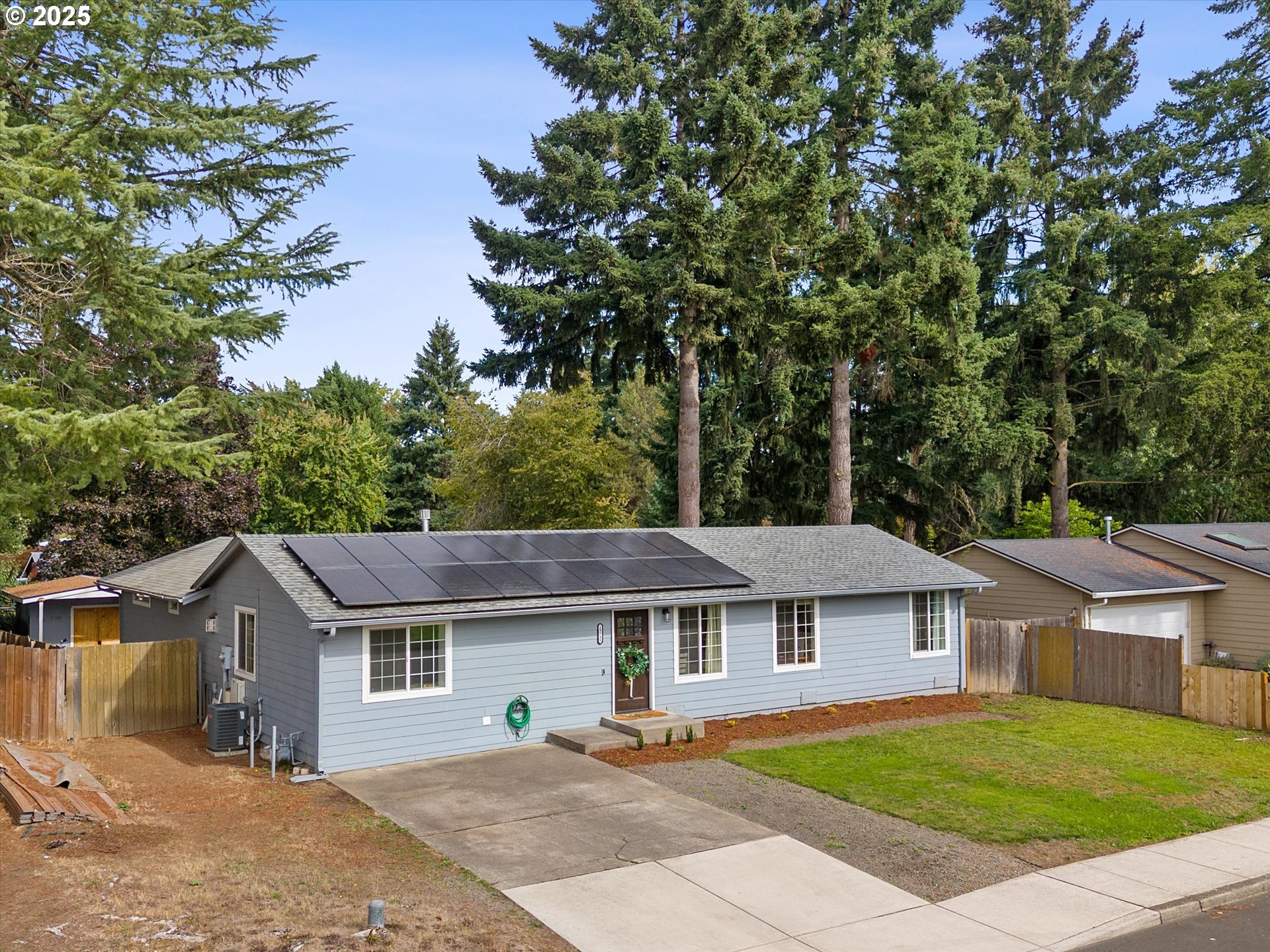 - Super hip and stylish, this four-bedroom, single-level ranch blends rustic charm with modern elegance on a large fenced lot with possible RV parking. Thoughtfully remodeled, the home showcases reclaimed wood accents, barn doors, an open and airy layout, and a beautifully designed kitchen featuring granite countertops, a farmhouse sink, stainless steel appliances, a gas range, and open shelving that adds warmth and character. The spacious primary ensuite is a true retreat, with French doors opening to the deck, a generous walk-in closet, a luxurious soaking tub, and a beautifully tiled shower. Three additional bedrooms are tucked away on the east wing, providing both privacy and flexibility for family, guests, or a home office. Outside, the backyard offers plenty of space to relax and entertain, with a sunny deck, an above-ground pool, and a versatile outbuilding perfect for a creative retreat or workshop. Fully paid solar panels, mature shade trees, and possible RV parking add convenience and long-term value. The garage has been converted into a large utility room, sparking possibilities for future customization. With no HOA, pride of ownership throughout the neighborhood, and a location just minutes from Nike, Intel, shopping, dining, and Hazeldale Park, this home perfectly balances comfort, convenience, and character. Schedule your showing today and discover all that this one-of-a-kind property has to offer! Video and audio devices outside and inside. Buyer responsible for all due diligence including but not limited to remodel/conversion (none done by current owner), RV parking and short term rental.